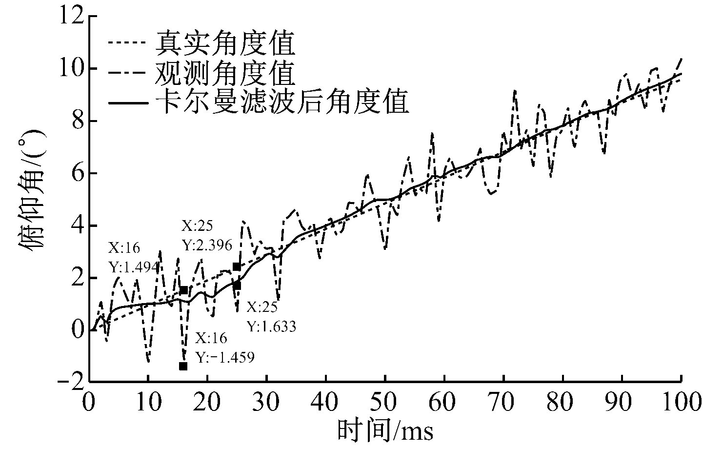 式(10)—式(12)是观测更新方程的核心公式,是整个递归计算的后验估计,也是下一时刻的先验估计,通过不断更新误差协方差Q和R的值,反复运算,直到找到各个时刻的最优俯仰角值。