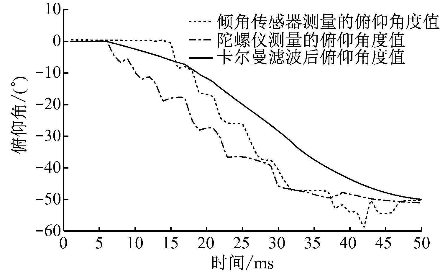 通过行车拉动支架顶梁使俯仰角从0变加速降到-50°左右,测试曲线如图10所示。在动态工况下,卡尔曼滤波后的俯仰角角度比单纯利用倾角传感器和陀螺仪测量的角度更平滑,在43 ms时,倾角传感器受运动加速度影响,测量角度超过50°,几乎达到60°,经卡尔曼滤波后角度更接近真实值。
