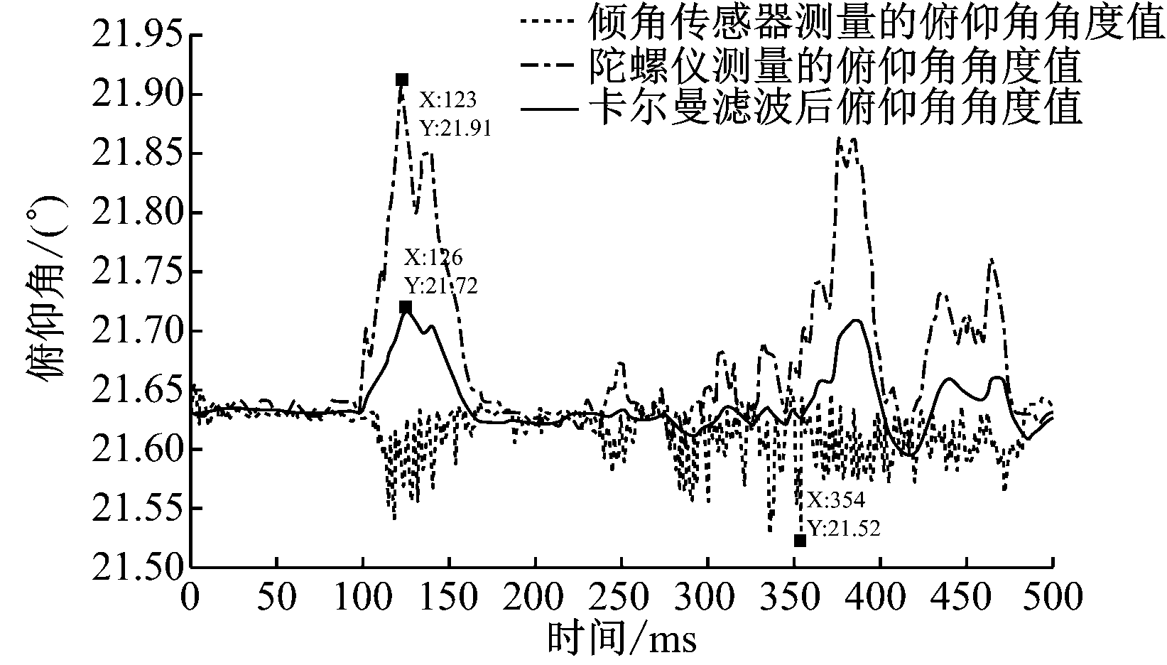 卡尔曼滤波前后效果如图6所示。从0开始,观测角度值明显存在振荡,最大振荡幅度达到2.953°。但是经卡尔曼滤波后,滤波效果明显,卡尔曼滤波后的角度值刚开始存在细微振荡, 最大振荡幅度达到0.763°, 50 ms后角度值接近俯仰角的真实值。