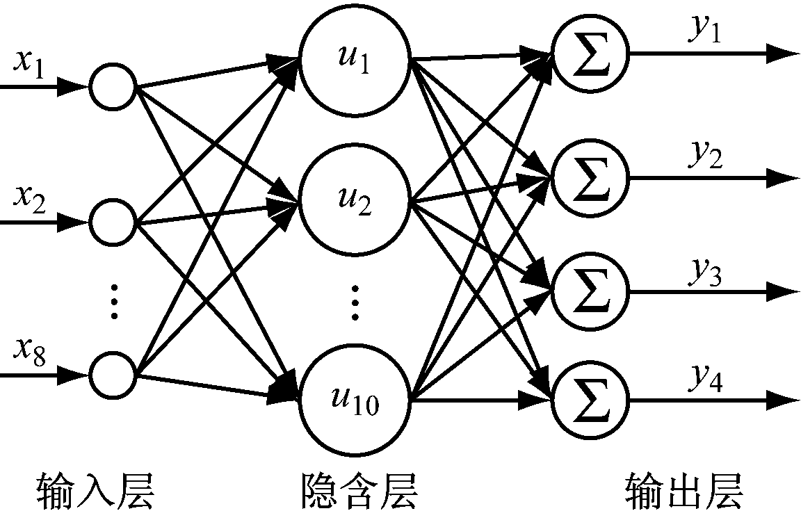 采煤机滚动轴承故障诊断系统包括压电传感器、电荷放大器、数据采集系统和计算机。采煤机主要部件的振动信号通过压电传感器采集,经电荷放大器放大转换为电信号,由数据采集系统接收,再对这些原始数据进行小波分析和特征提取,最后在计算机上由基于TDKM-RBF神经网络的故障诊断算法对采集到的数据进行故障分类。根据故障发生位置的不同,滚动轴承故障可分为滚动轴承内圈故障、滚动体故障、外圈故障3种[16]。本文将故障诊断系统收集到的64组数据作为TDKM-RBF神经网络的训练及测试数据,将采集的振动信号利用coif5进行3层小波包分解,提取第3层的8个频带的小波包能量谱尺度作为样本的8个特征向量。采用试凑法确定隐含层层数为10层,构造出结构为 8-10-4 的RBF神经网络,再根据TDKM算法确定的径向基函数的参数自动完成训练。RBF神经网络拓扑结构如图2所示。