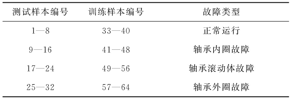 采用仿真软件Matlab R2014a对64组滚动轴承故障数据进行仿真,其中训练数据为32组,测试数据为32组,具体样本的故障类型见表1。