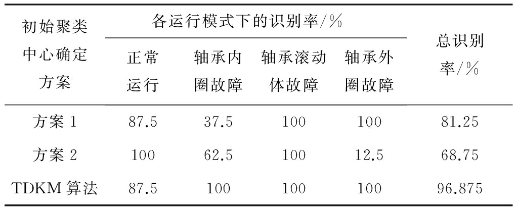 对比方案1和方案2,虽然方案2的迭代步数仅为方案1的40%,但是识别率低至68.75%。方案1的识别率虽高至81.25%,但是迭代步数为10,耗费时间较长。可见,若用传统的K-means算法,故障识别率和运行时间均会有较大的波动。