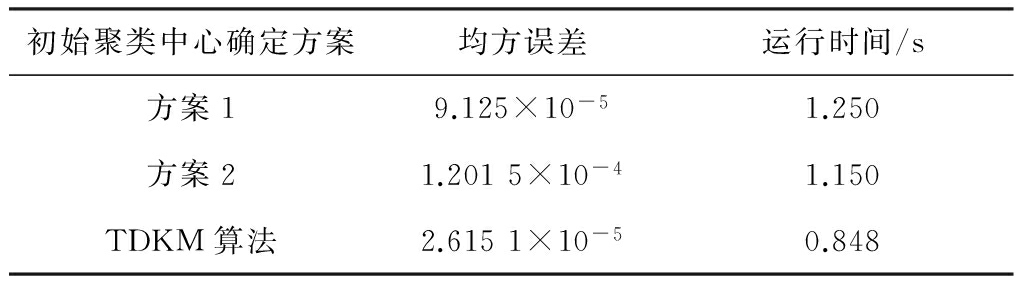 采用TD算法得到32组训练数据的两两样本的距离矩阵和样本间欧氏距离的均值矩阵A,剔除训练数据中的噪声样本:第33—40组,第44组,第45组数据,形成新的距离矩阵A,按照最小距离原则对其进行遍历,生成最小生成树,再进行3次剪枝得到4个子树,分别对4个子树中的样本求取均值得到4个类的初始聚类中心。将这种采用TDKM算法确定初始聚类中心的方案与以下2种任意选取初始聚类中心的方案作对比。