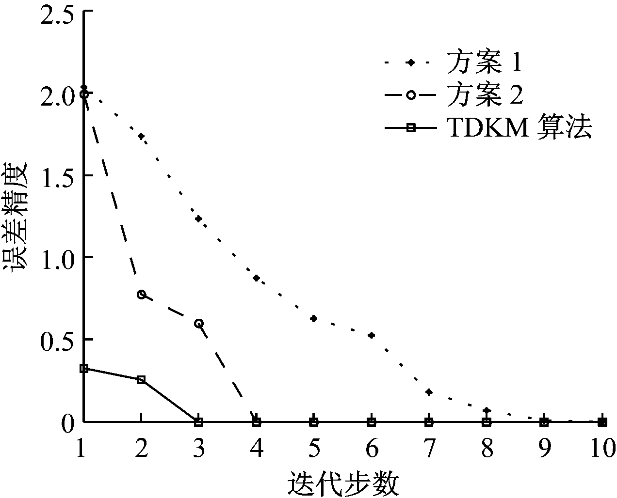 由表3可知,3种方案均达到误差精度ε要求,与方案1和方案2相比,TDKM算法得到的聚类中心与达到迭代精度的聚类中心十分接近,仅需3次迭代即达迭代精度,且运行速度最快仅需0.848 s。根据表2可知,该算法对轴承内圈、滚动体和外圈的故障识别率为100%,整体识别率高达96.875%,运行时间仅为传统K-means算法的40%。经多次试验,其迭代步数始终为3步,且故障识别率维持在96.875%不变。