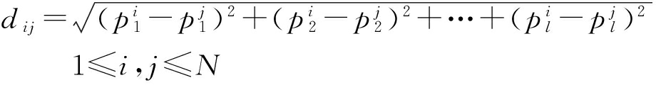 设数据样本集D(m1,m2,…,mN)中含有N个样本,每个样本均含有l个特征向量,根据式(1)计算D中任意2个样本mi(p1i,p2i,…,pli)和mj(p1j,p2j,…,plj)之间的欧氏距离dij,根据dij即可得到样本空间中两两样本的距离矩阵B,如式(2)所示。将距离矩阵B中的每列取平均值得到每个样本与其他所有样本距离的均值矩阵A,如式(3)所示。