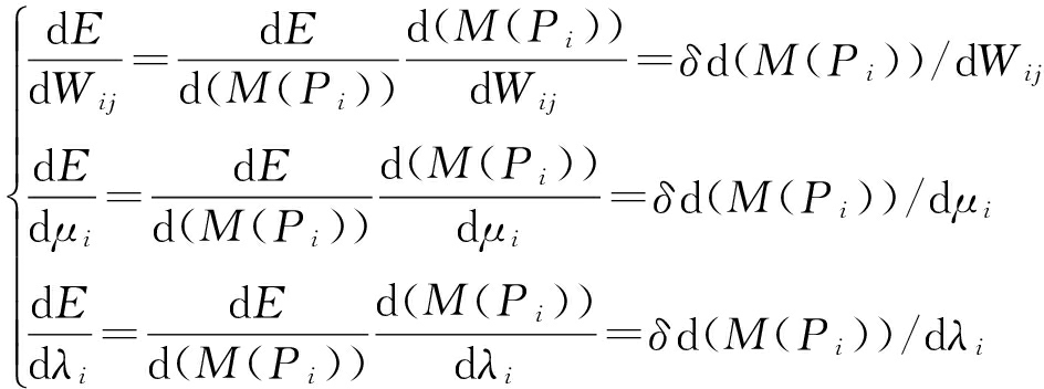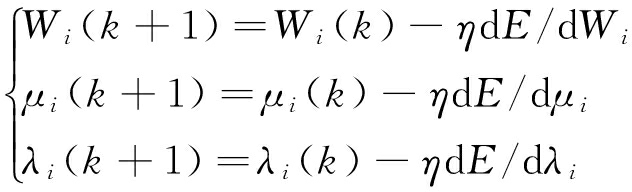在EFPN模型的参数调整中,设置的初始参数值代表输入,故障诊断的结果表示输出,要进行调整的参数是各个连接权值(W)和阈值(λ)。根据式(5)-式(6)求取一阶梯度: