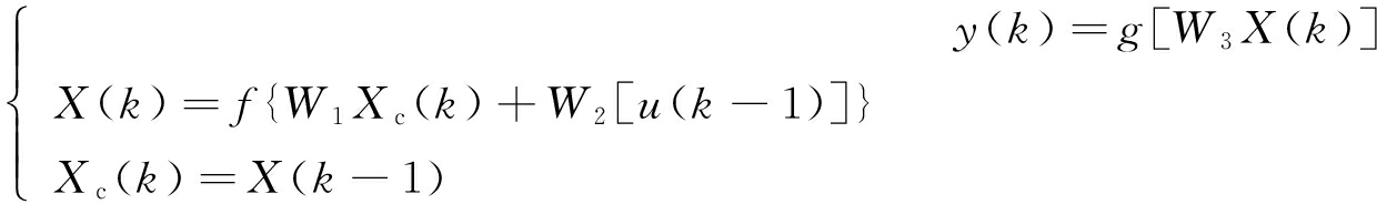 式中:W1为状态层到中间层的连接权值; W2为输入层到中间层的权值;W3为中间层到输出层的权值;u为网络输入;X,Xc分别为隐含层与状态层输出;y为网络输出;f(·)为S型激活函数;g(·)为输出神经元的传递函数。
