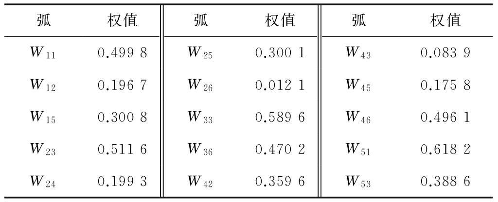 参照专家的相关经验,现设置其阈值λ1—λ5均为0.5,可信度μ1—μ5均为0.8。各个弧上权值的初始值设定:W11 =0.3,W12=0.5,W15=0.2,W23 =0.15,W24=0.25,W25=0.15,W26=0.45,W33 =0.35,W36 =0.65,W42 =0.3,W43 =0.1,W45 =0.05,W46=0.55,W51 =0.4,W53 =0.6。