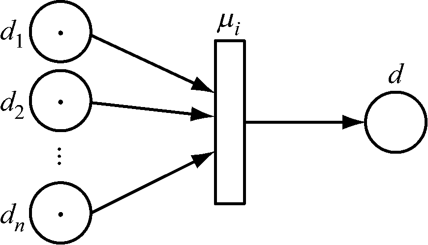 定义2 如果在模糊产生式规则中的前提条件或结论部分有“and”、“or”,称此规则为合成式规则。本文的单层单指向网络的规则类型为IF dl and d2 and … and dn THEN d(CF=μi),d为结果命题,如图1所示 。