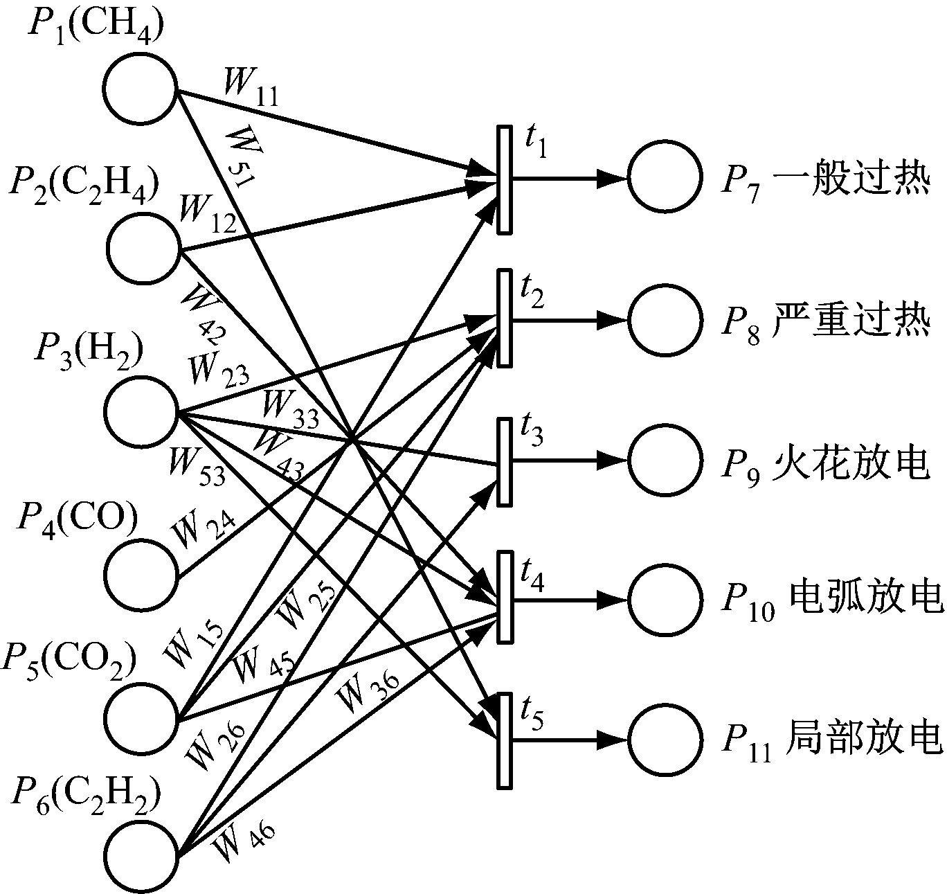 依据变压器油中产生的主要气体CH4,C2H4,C2H6,C2H2,CO,CO2与总烃(C)来进行矿用变压器的内部故障诊断,其中C作为一个整体进行衡量[12-13]。以这些特征气体(P1-P6)作为输入库所(故障征兆),变压器的5种故障(P7-P11)作为输出库所。根据故障征兆与故障之间的关系,利用模糊产生规则来建立EFPN故障诊断模型,如图2所示。依靠该模型可诊断出变压器的故障类型。