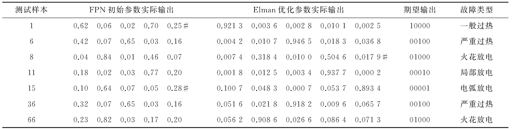 分别用FPN模型参数初始值与Elman优化后的参数,对66组测试样本进行故障检验,其中EFPN模型诊断正确的有58组,准确率为58/66 =87.88%;FPN模型诊断正确的有50组,准确率为50/66 =75.76%。仿真结果表明,Elman优化值的诊断结果错误率更低。因测试样本数据过多,表2给出了部分测试样本诊断结果,#表示诊断错误。