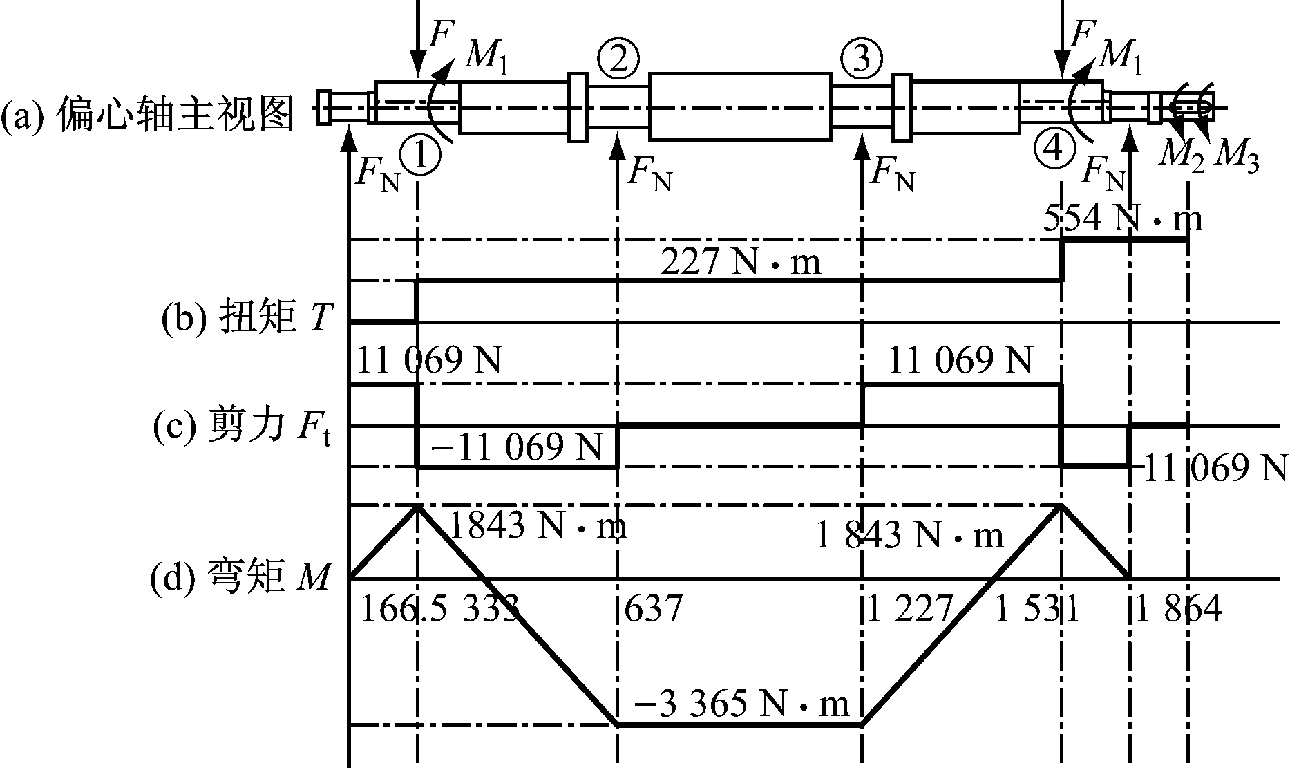 至此,即可画出整个偏心轴的扭矩图和弯矩图,如图6(b)和(d)所示。