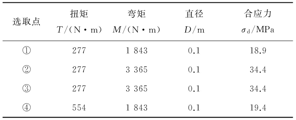 从图6可以看出,点①—点④为危险点,容易产生疲劳破坏。现对这4点的合应力进行分析,分析结果见表1。