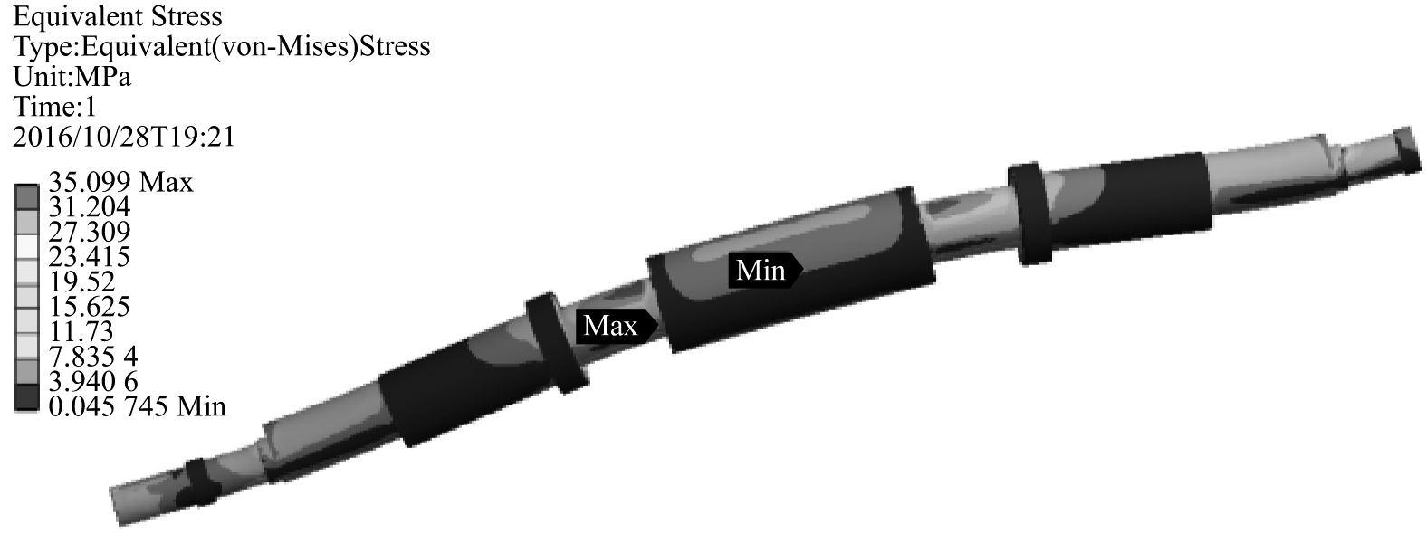 由图9可知,偏心轴上的危险部位出现在中间轴承座支撑处,最大应力值σd为35.099 MPa,与解析法所得结果基本一致。