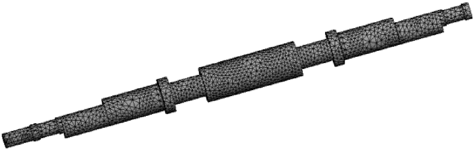 有限元法能够根据偏心轴的实际工作情况来施加约束与载荷,对真实物理系统进行模拟,采用有限元法能够得到更加准确的应力分布云图。将偏心轴的三维模型导入Workbench中,采用自由划分法对偏心轴进行网格划分[9-10],网格划分时全部划分为Solid187,Solid186实体单元,共有15 496个单元和27 384个节点。偏心轴的有限元模型如图8所示。