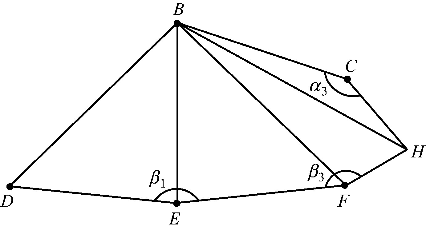 (2) 测点A与D坐标相同,测点B与E、测点C与F坐标不同。该种情形下,物料截面积算法如图3所示。由于测点A,D坐标相同,说明线段AD处没有检测到物料,在△BDE范围内,没有可以参考的点。该算法以高估物料量为原则,以测点D为多边形顶点。作射线FH,使其与线段EF的夹角β3=β1;作射线CH,使其与线段BC的夹角α3=β3。射线CH与FH的交点H即多边形的另一个顶点。