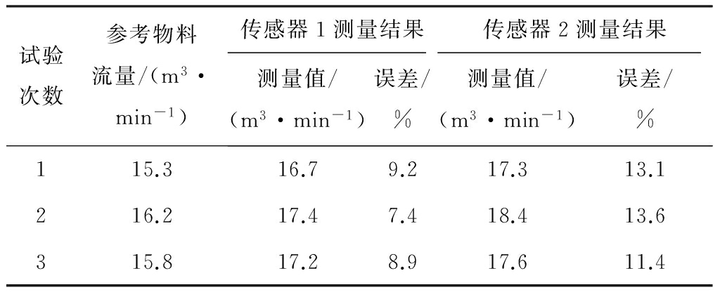 从表1可看出,传感器1和传感器2测量结果较参考值均偏大,这与物料截面积的近似算法有关。但在煤块体积较大且不均匀的情况下,传感器1测量误差更小。