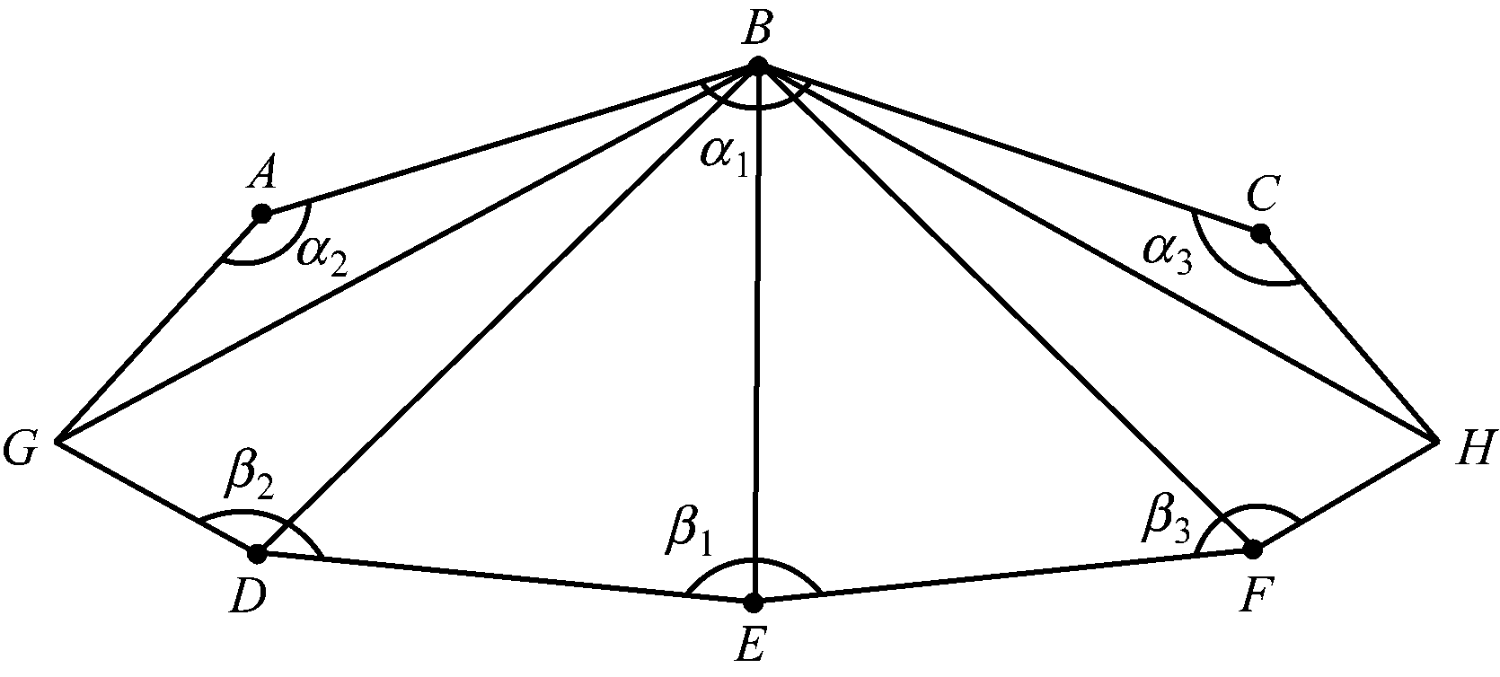 (1) 测点A与D、测点B与E、测点C与F的坐标均不同。该种情形下,物料截面积算法如图2所示。将物料截面近似成一个多边形,测点A,B,C,D,E,F为该多边形的6个顶点,G,H为另2个顶点。测点A,B,C坐标已知,根据余弦定理,可以求得线段AB与线段BC的夹角α1。作射线AG,使其与线段AB的夹角α2=α1。同理作射线DG,使其与线段DE的夹角β2等于线段DE与线段EF的夹角β1。射线AG与DG的交点G即为多边形的一个顶点。按照同样的方法可以求解多边形的另一个顶点H。多边形的8个顶点全部确定后,作线段BG,BD,BE,BF,BH,将多边形划分成6个三角形。每个三角形的顶点坐标都是确定的,由此可以求解每个三角形的边长,根据海伦公式可以求解每个三角形的面积,6个三角形的面积之和即为多边形的面积。多边形的面积近似为物料的截面积,其与胶带速度的乘积即为物料流量。