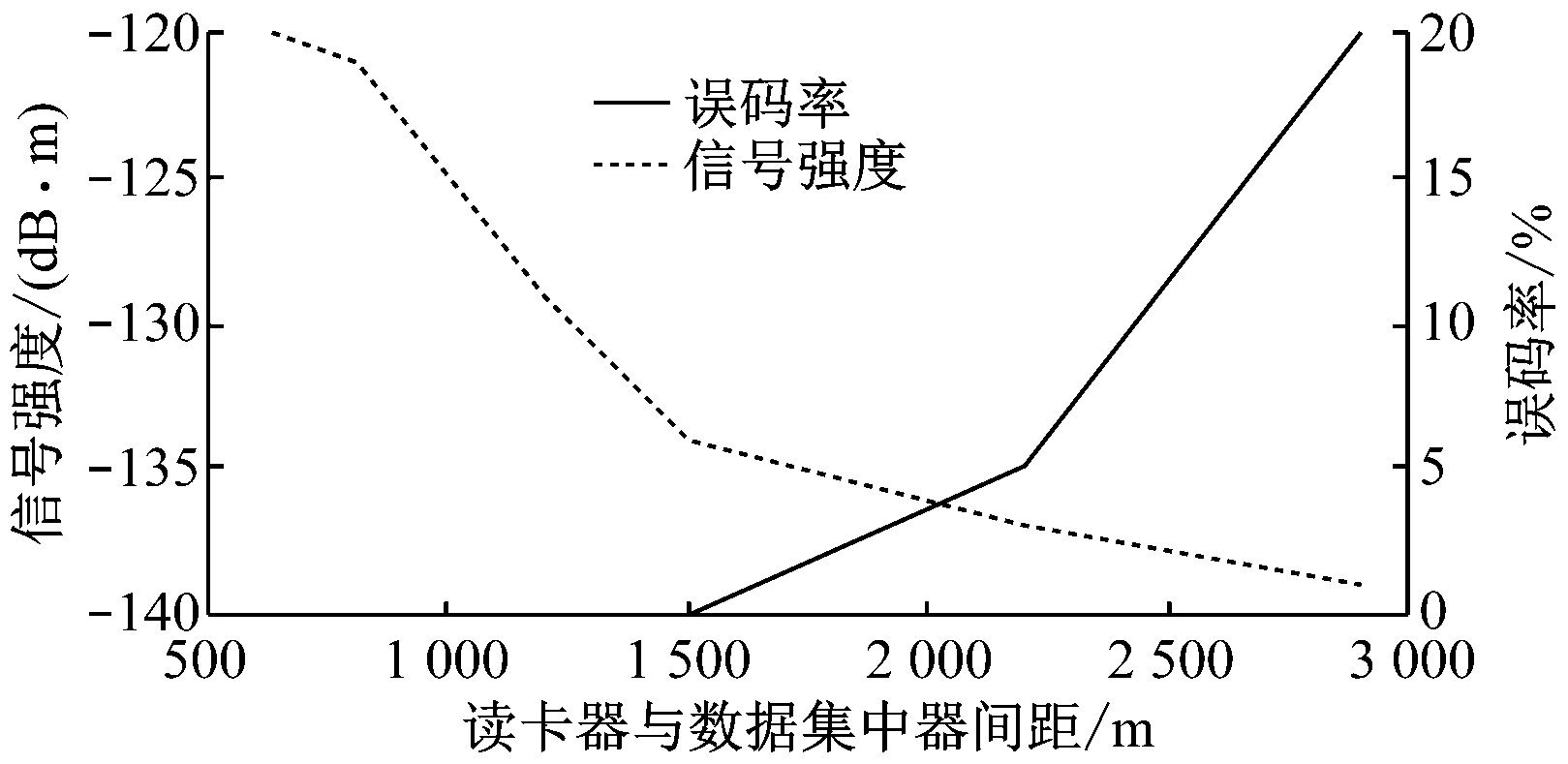 数据集中器初始位置距离读卡器500 m,然后将数据集中器逐渐远离读卡器,测试读卡器与数据集中器之间的通信误码率和信号强度,如图4所示。可看出当读卡器与数据集中器间距小于1 500 m时,系统无线通信误码率为0,在间距为2 000 m处的无线通信误码率小于5%。这是由于采用LoRa无线通信技术的SX1278芯片的接收灵敏度可达-137 dB·m,而在2 000 m范围内测试到的信号强度大于-137 dB·m,所以系统可实现读卡器与数据集中器之间的远距离无线数据可靠传输。
