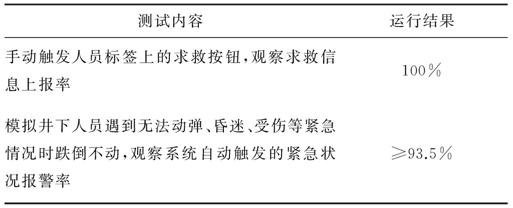 设置自动求救时间阈值为900 s,测试系统的紧急状况处理方案运行效果,见表1。可看出系统在井下人员遇到无法动弹、昏迷、受伤等紧急情况时的自动报警率不低于93.5%,弥补了现有精确人员定位系统仅有手动求救方式的缺陷,为井下人员的人身安全提供了更全面的保障。