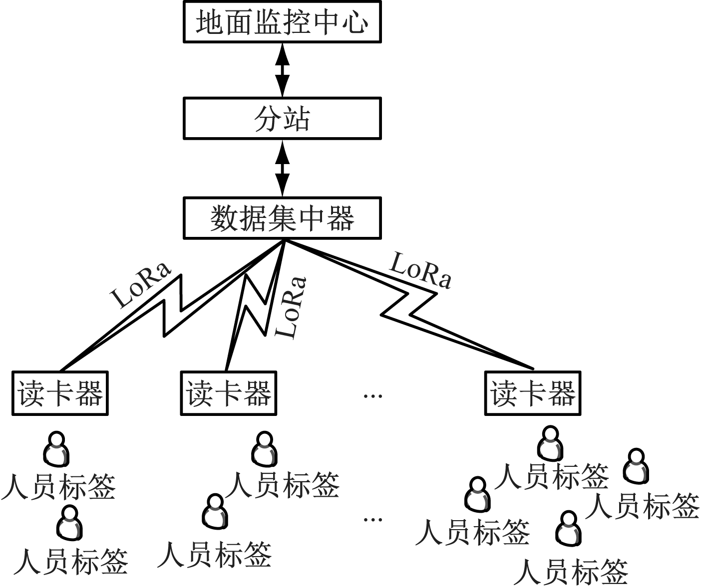 矿用智能精确人员定位系统主要由人员标签、读卡器、数据集中器组成,如图1所示。井下人员携带人员标签,并可通过人员标签上的求救按钮发送求救信息;读卡器对携带人员标签的井下人员进行定位,获取人员标签的位置、求救信息等数据;数据集中器通过无线通信方式获取读卡器上的数据并上传至分站;地面监控中心根据分站上传的数据做出相应的管理决策。