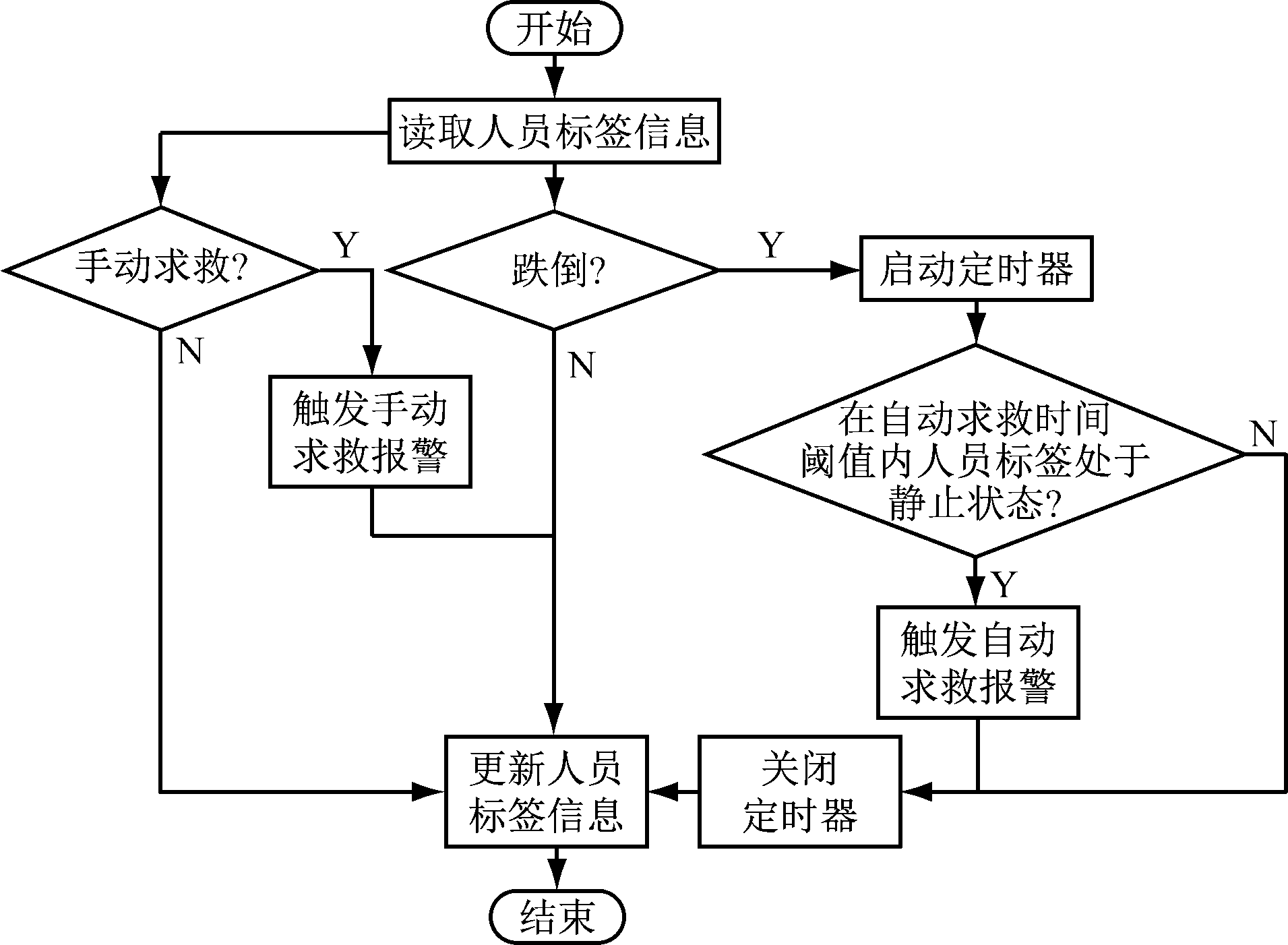 当遇到紧急状况时,井下人员可通过手动触发人员标签上的求救按钮,通知管理人员进行救援。但当井下人员遇到无法动弹、昏迷、受伤等情况时,通常会跌倒在地而无法进行手动求救。此时人员标签会检测到携带者跌倒并立即上传跌倒信息,地面监控中心接收到跌倒信息后启动定时器,如果超过设置的自动求救时间阈值后人员仍处于静止状态,则系统认为该人员出现危险,触发自动求救报警通知管理人员进行救援。