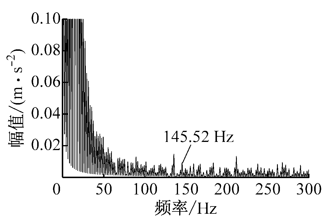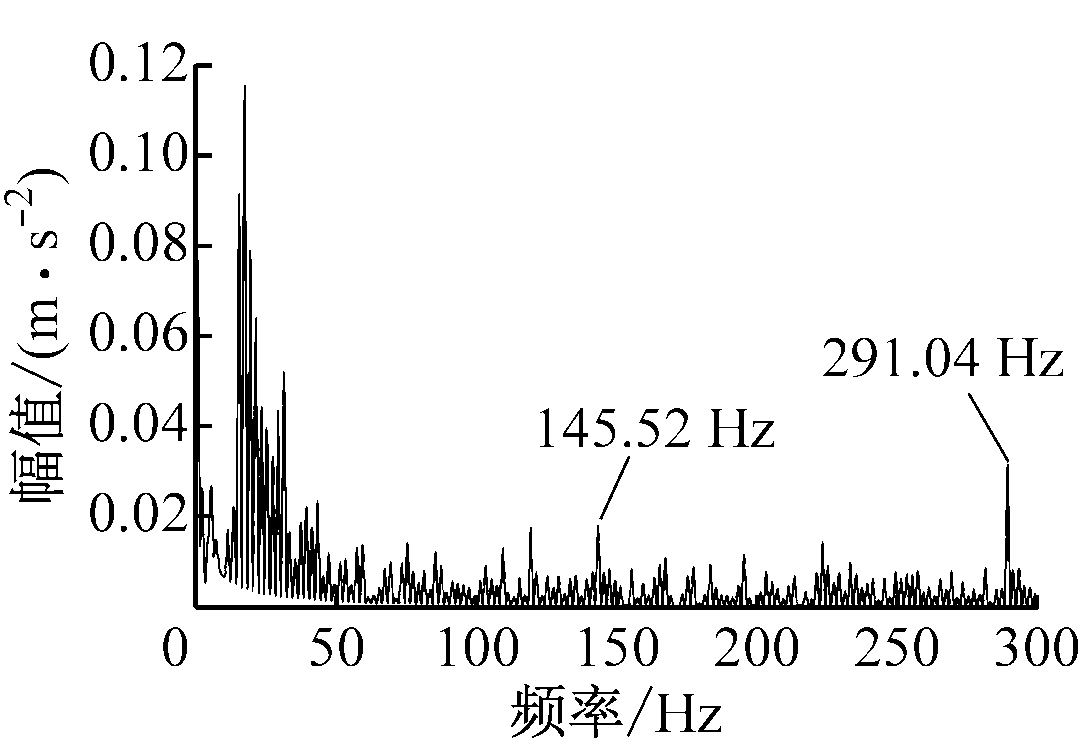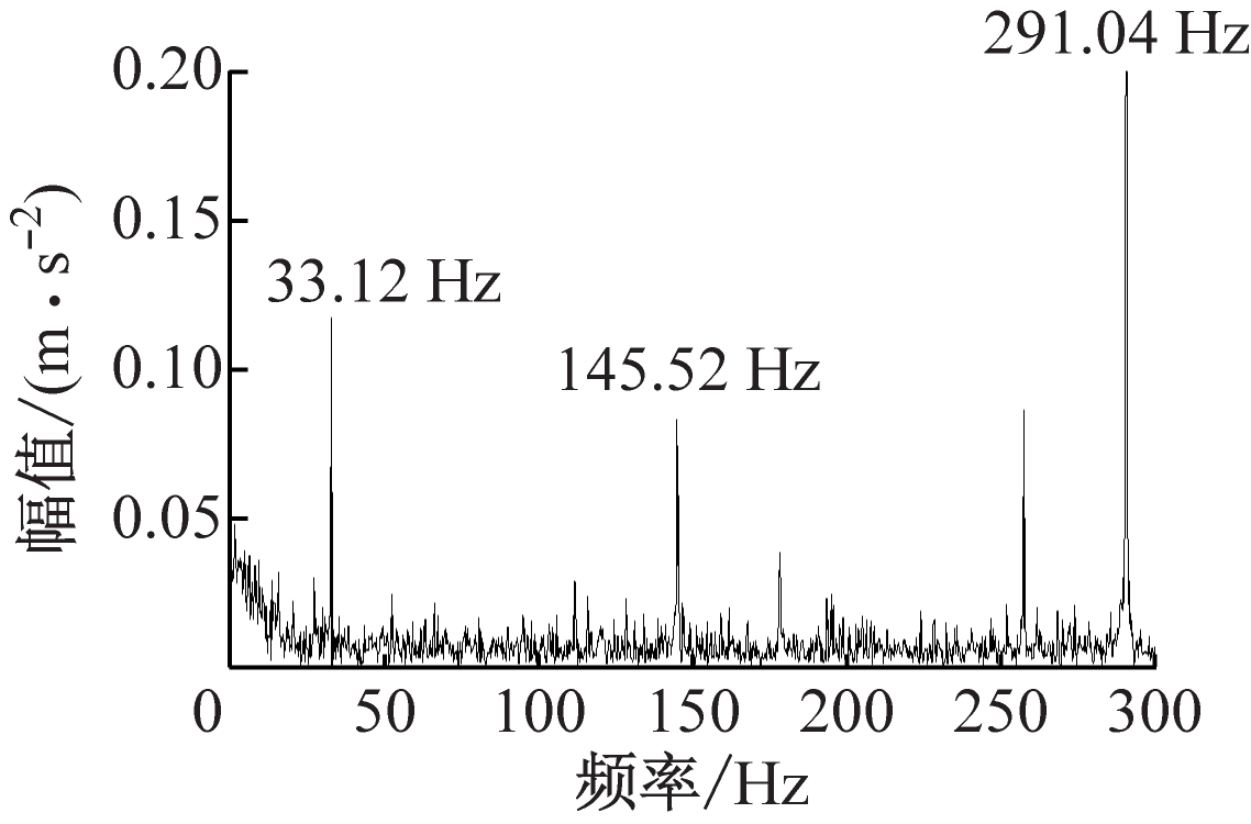 分别采用形态滤波算法、希尔伯特变换方法和改进FastICA算法对故障特征频率进行提取,所得频谱如图7所示。从图7(a)可看出,形态滤波算法提取出的轴承内环故障特征频率基本淹没在噪声中;图7(b)中,希尔伯特变换方法虽然提取出了轴承内环故障特征频率,但由于噪声和其他干扰,提取效果不理想;从图7(c)可清晰看到轴承内环故障特征频率145.52 Hz及其2倍频291.04 Hz,同时发现基频的2倍频33.12 Hz,根据文献[15-16]关于不对中故障特征的描述,说明电动机转子发生了不对中故障。这是由于振动筛在大振动量级下运转时,大偏心块产生的径向力对传动轴产生较大影响,传动轴在旋转时发生了不对中现象。
