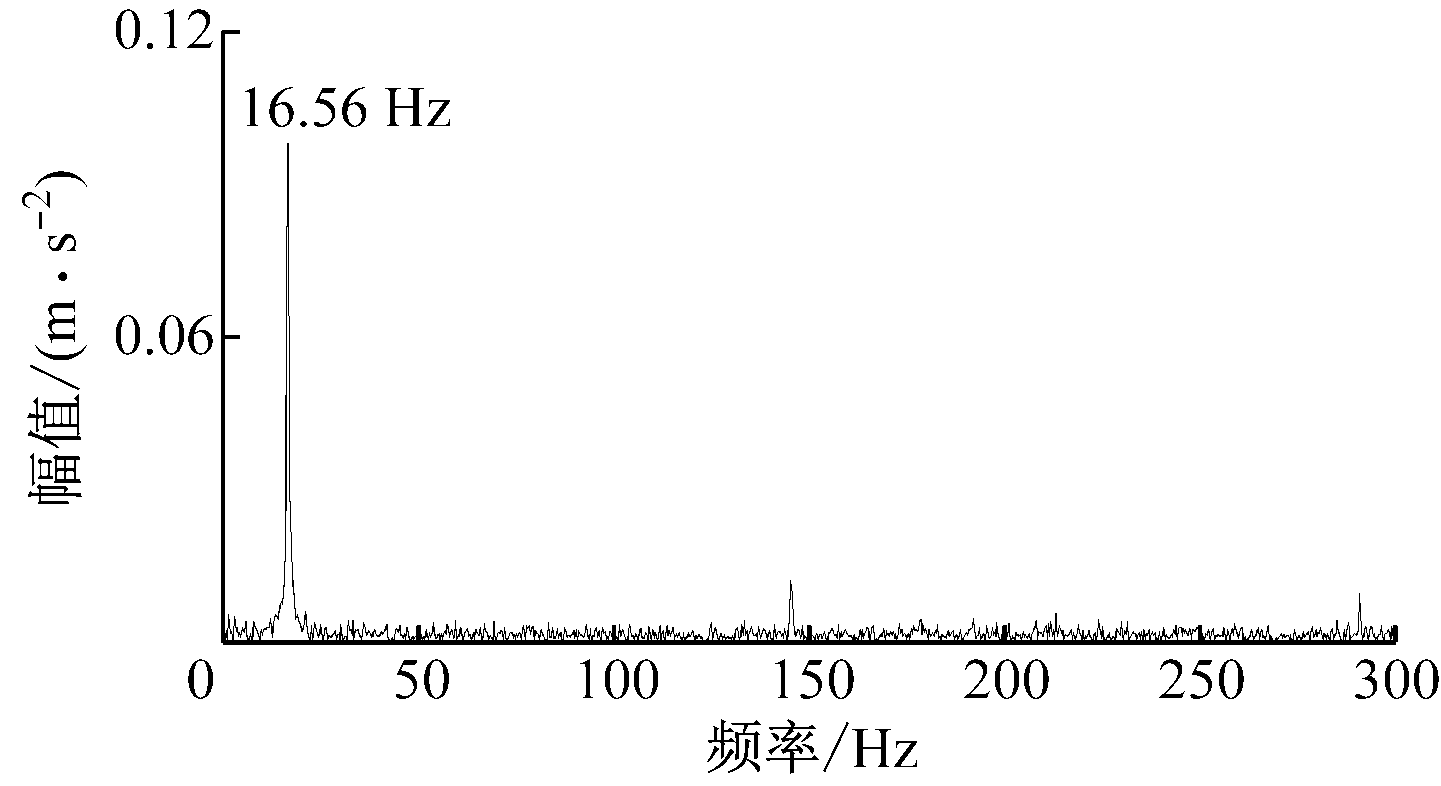 采集的振动信号时域波形及其频谱分别如图5、图6所示。从图6可看出,内环故障特征频率已被噪声和其他干扰淹没,并没有在图中显现,只有基频频率16.56 Hz。