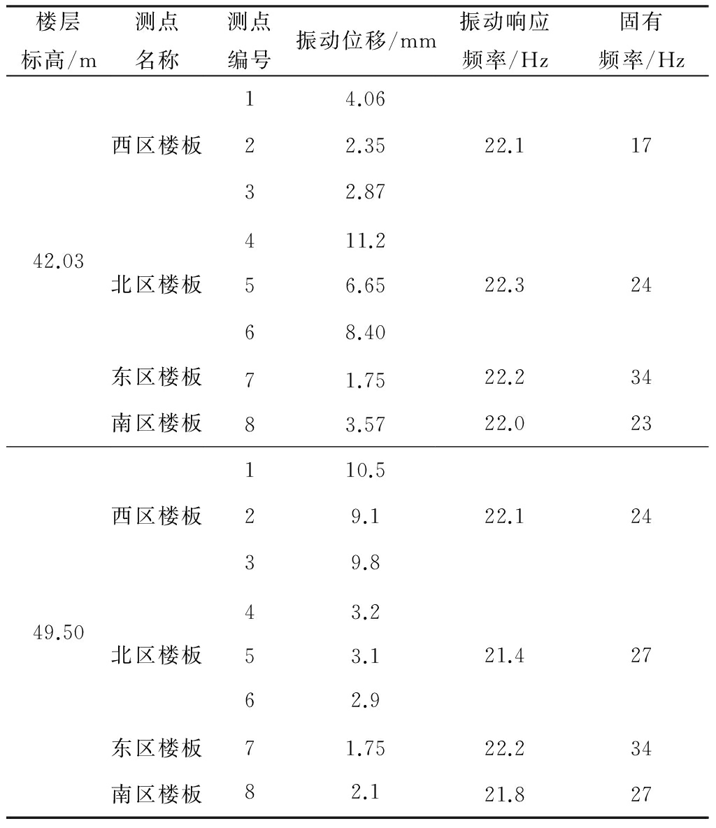 第6层、第7层楼板的测点布置如图4所示,振动测试情况如图5所示。第6层、第7层楼板在满载最危险工况下,其振动测试及分析结果见表2。