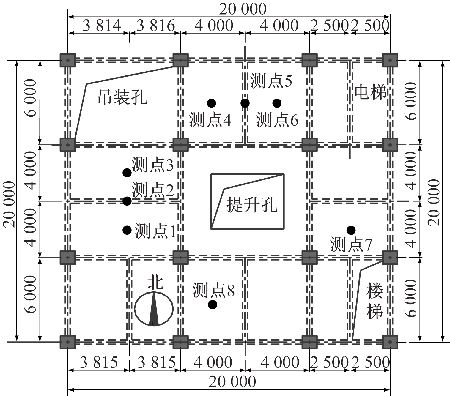 伊化矿业资源有限责任公司母杜柴登矿立井井塔塔高为81 m,主立井井塔断面为20 m×28 m,设计楼层为10层,为方形框架式钢筋混凝土结构。立井井塔在68.37 m楼层上安装有1套提升系统,提升系统在运行过程中的振动通过梁、柱或墙体传播,使其支撑结构发生二次振动和噪声。当振动超过容许值时,会引起支撑结构产生裂缝、混凝土保护层剥落,甚至被损坏。提升机组的振动所产生的不平衡干扰力,也会引起其支撑结构的疲劳、应力集中,影响支撑结构的安全性和耐久性[1-2]。提升机组在提升速度为13 m/s(加速度为±0.7 m/s2)下全速(满载、半载、空载)运转过程中,井塔楼板第7层西区楼板的中部及第6层南区、北区楼板的中部楼板体系产生了较大的振动。为了控制振动的幅值,采用减速措施将导致矿井产量降低,经济效益下降。鉴此,本文采用振动测试方法对提升机-井塔结构耦合体系进行振动分析,为提升机-井塔结构耦合体系的减振改进提供数值依据。