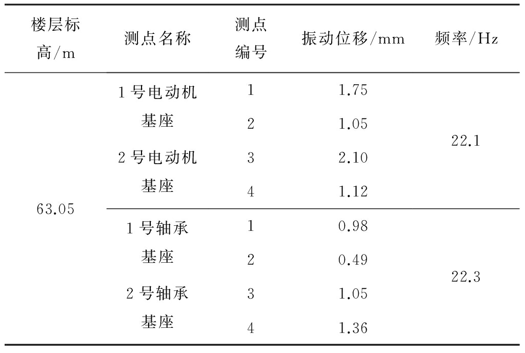 从表1和图3可知,电动机基座及轴承基座各测点的振动频率均与电动机的固有振动频率接近,当其各测点的频率越接近电动机的固有振动频率(22.1 Hz)时,其测点处的振动位移就越大,引起其耦合结构体系发生共振。