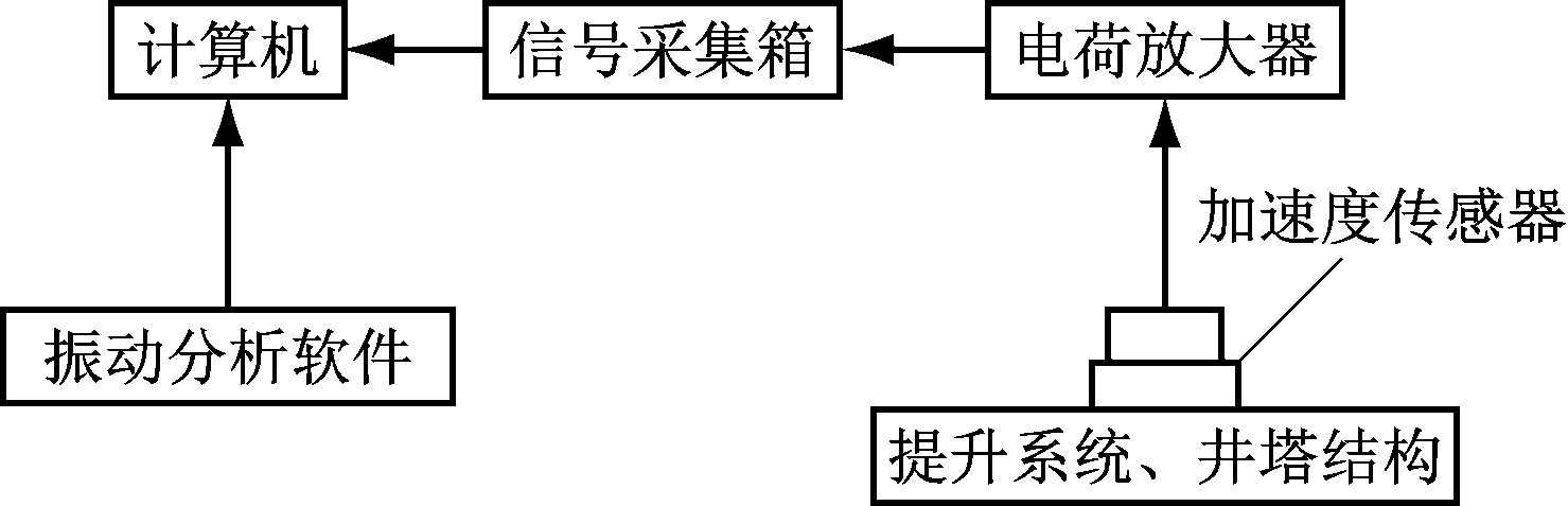 立井井塔提升系统及井塔振动测试系统由加速度传感器、电荷放大器、8通道信号采集箱DH5922、DASP-16信号采集箱和动态信号处理软件组成。加速度传感器拾取被测对象(提升机、井塔结构等)的振动信号,该信号经过电荷放大器滤波、放大和变换(速度、位移)后送入信号采集箱,然后再将该数字化振动信号传输到计算机,计算机利用动态信号软件进行示波、存储、分析与处理。振动测试系统框图如图1所示[7]。