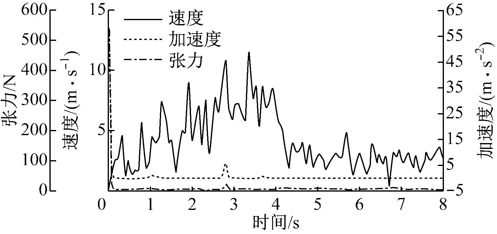 仿真运行结果如图4所示。在启动过程中,输送带张力及加速度处于最大值,此时输送带速度由于输送带的黏弹性特性呈振荡上升状态,进一步导致输送带局部位置出现张力上升现象。控制系统通过控制输入驱动力调整带式输送机实时运动状态,实现输送带速度最终趋于平稳。