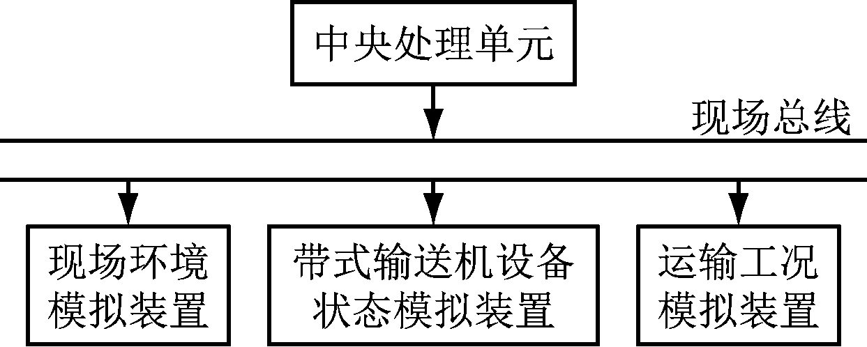 HIL仿真测试硬件平台包括中央处理单元、现场环境模拟装置、运输工况模拟装置、带式输送机设备状态模拟装置,如图2所示。中央处理单元根据带式输送机运动学模型计算出的迭代状态,通过现场总线向运输工况模拟装置及带式输送机设备状态模拟装置发送数据,更新运输工况及设备运行状态(滚筒温度、滚筒转速、输送带速度、输送带张力等)。通过随机算法产生现场环境干扰数据,并通过现场总线向现场环境模拟装置发送数据,模拟现场环境参数(温度、湿度、粉尘浓度、烟雾浓度等)。