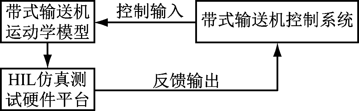 带式输送机控制系统HIL仿真测试系统利用计算机仿真模拟带式输送机运行,通过模拟装置输出带式输送机设备状态、运输工况及现场环境的物理量,带式输送机控制系统的传感器检测模拟装置输出物理量后,结合其控制策略对带式输送机运动状态进行修正,从而形成闭环反馈控制,达到对带式输送机控制系统性能进行仿真测试的目的。