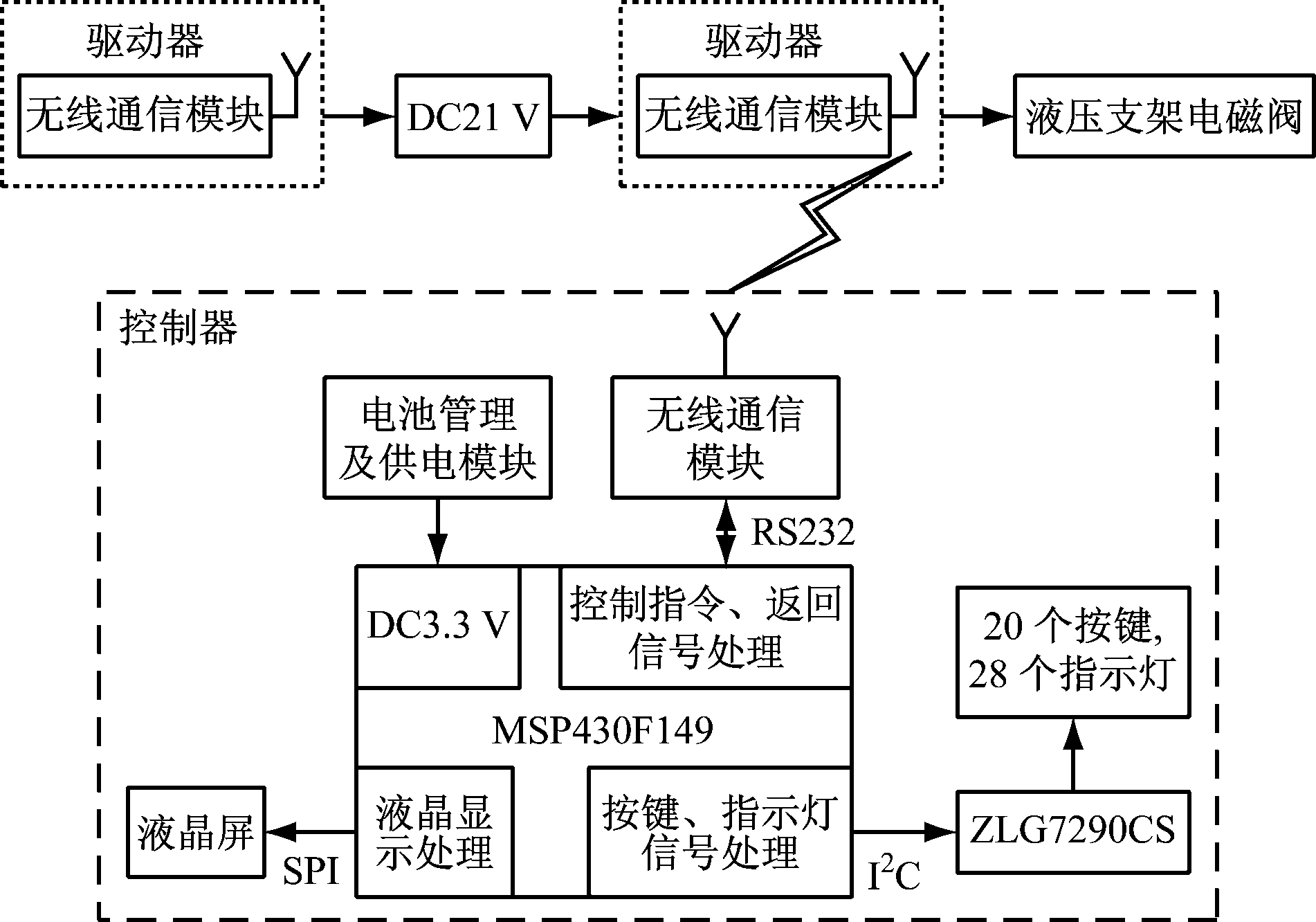 控制器是液压支架控制系统的核心设备,液压支架控制系统的动作指令通过控制器传送给驱动器,由驱动器驱动液压支架电磁阀动作,从而实现液压支架各种动作的自动控制。无线液压支架控制器硬件结构如图1所示。控制器的核心处理器选用MSP430F149,其为16位体系结构,有2个16位内置定时器、2个通用串行同步/异步通信接口、60 kB+256 B闪存、2 kB RAM,待机电流仅为1.6 μA,满足控制器设计及应用需求[6-7]。控制器由锂电池供电,电池管理及供电模块具有电量监测及电池充放电管理功能。控制器通过无线通信模块与驱动器进行控制指令与反馈信号的传输,通过SPI总线将液压支架动作状态、编号等信息发送至液晶屏上进行显示,通过I2C总线向键盘扫描管理及指示灯显示驱动芯片ZLG7290CS传输按键和指示灯信号。