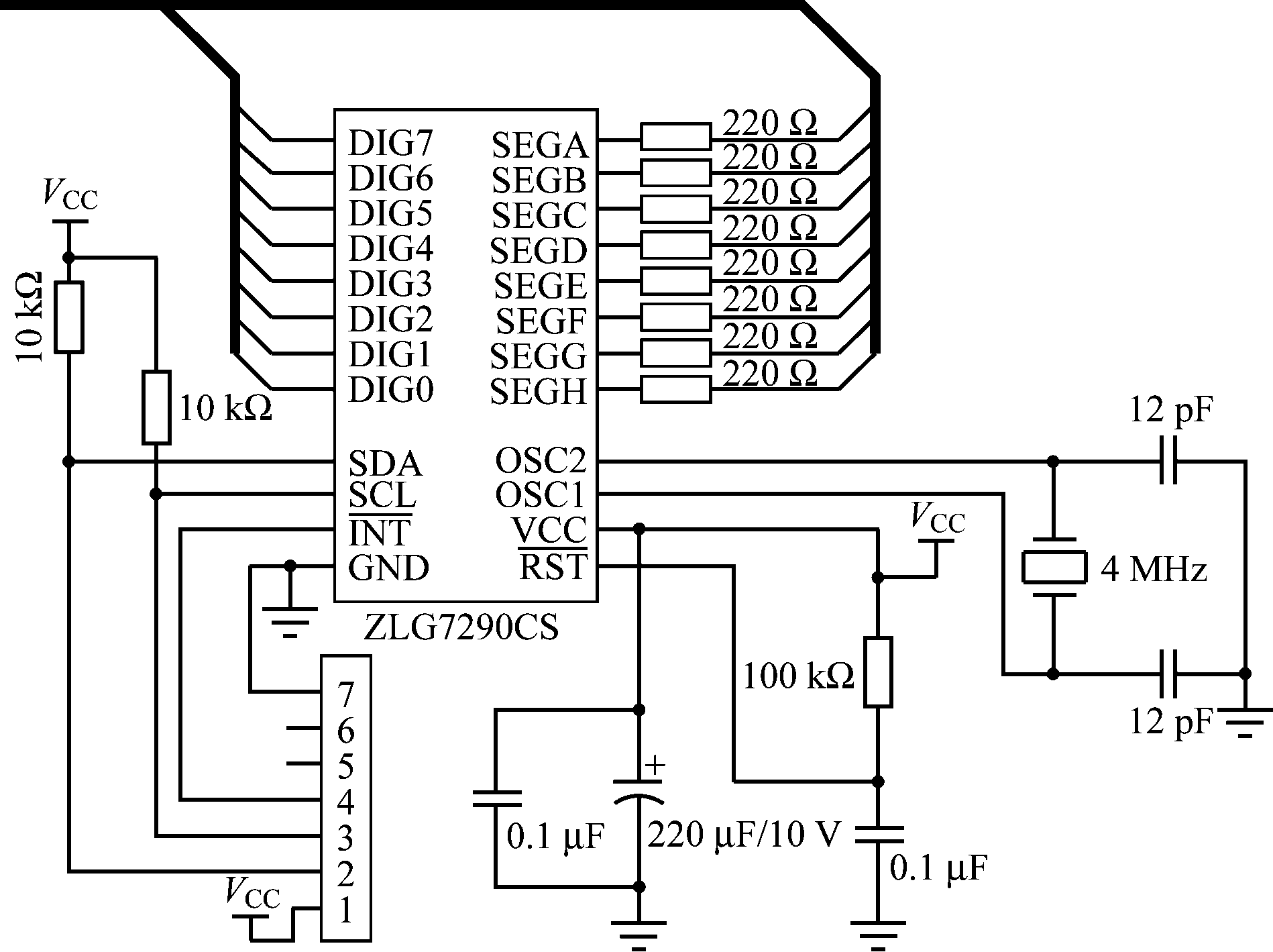 低电平有效,外接RC复位电路。根据I2C总线协议要求,信号线SCL和SDA必须分别加上拉电阻,取值10 kΩ。除电源外,ZLG7290CS只需将时钟信号线SCL、数据信号线SDA及键盘中断请求信号线