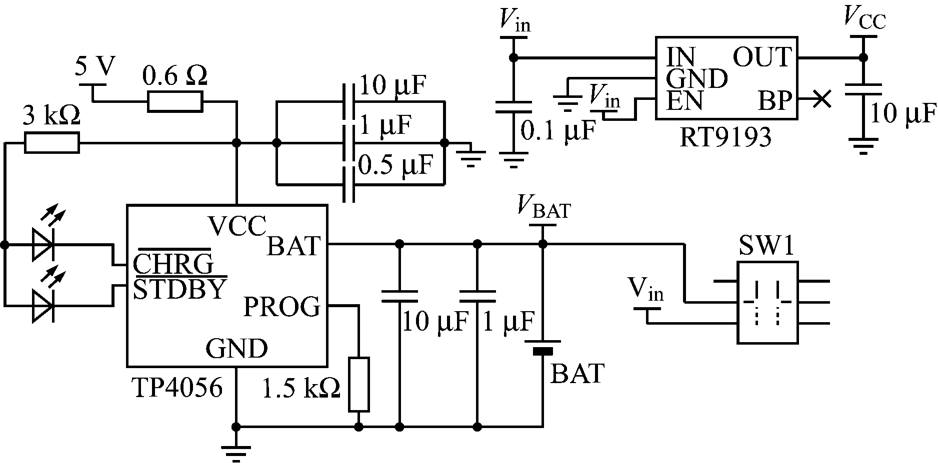 为实现稳压供电,采用低压差线性稳压器件RT9193,其具有极低的噪声和静态电流消耗,即使工作在直通状态下,其电流也只有轻微增大,可有效延长电池使用时间。RT9193 在关机模式下电流低于0.01 μA,启动时长小于50 μs,具有极低的电压差、高输出电压精度、电流限制保护和高纹波抑制比[13]。