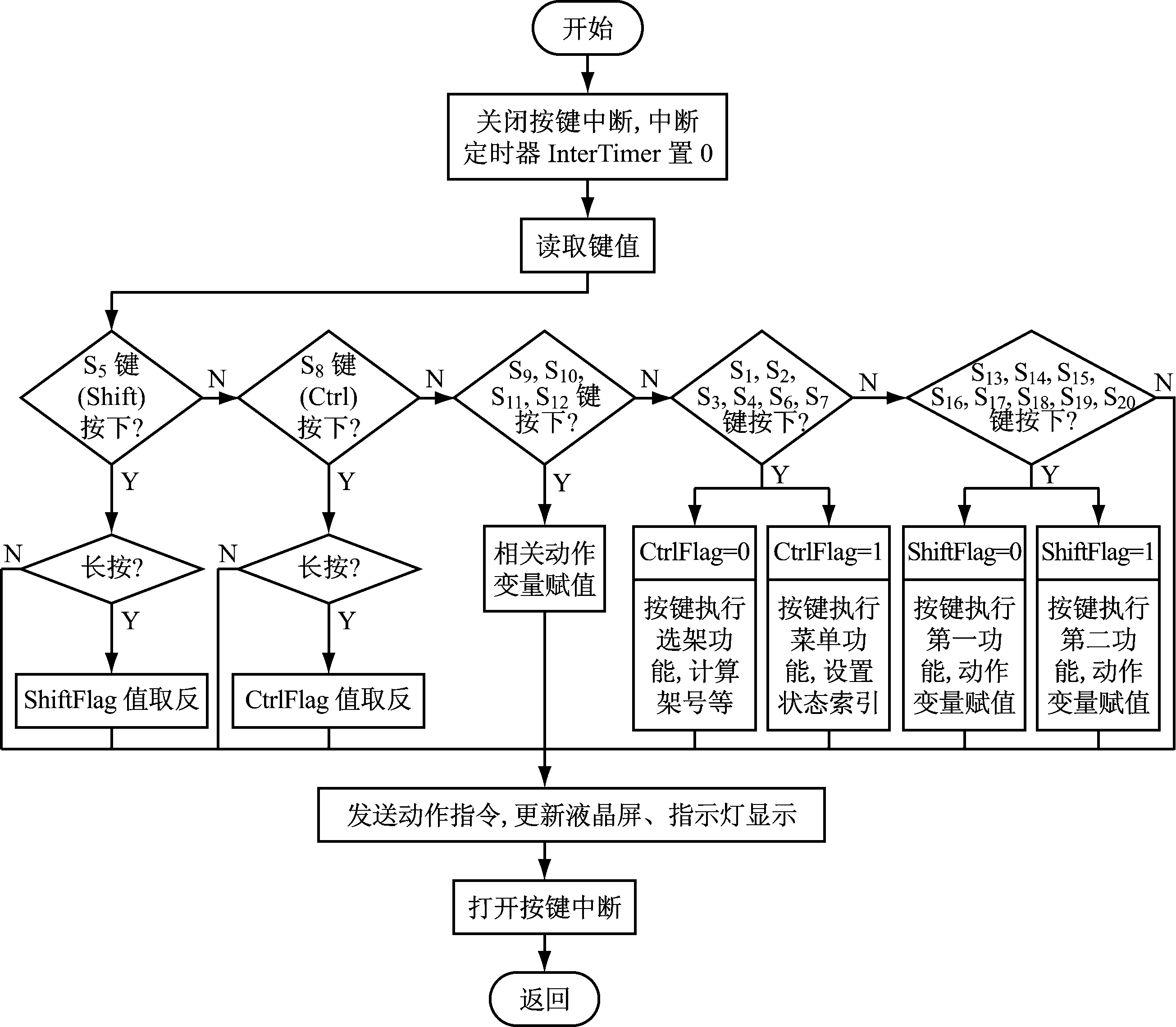 液压支架控制器的20个按键分为动作键和功能键。当按键动作发生后,如果控制器休眠则被唤醒,之后进入按键中断服务程序。为了避免程序响应同等优先级的中断请求,进入中断服务程序后首先关闭按键中断,并将用于控制器休眠的全局变量InterTimer置0。然后使用函数ZLG7290_GetKey()读取按键键值,使用函数ZLG7290_GetRepeatCnt()读取连击计数器的值,从而判断“长按”与“短按”,使用函数ZLG7290_SegOnOff()点亮或熄灭指示灯。S5键(Shift)和S8键(Ctrl)用于复用其他按键,“长按”时将对应的标志位ShiftFlag和CtrlFlag取反,“短按”则不产生作用。S9/S10键代表升/降柱,S11/S12键代表平衡伸/收。ShiftFlag为0时,S13/S14键代表前梁伸/收,S15/S16键代表一级护帮伸/收,S17/S18键代表侧护伸/收,S19/S20键代表推溜/移架;ShiftFlag为1时,S13/S14键代表抬底伸/收,S15/S16键代表二级护帮伸/收,S17/S18键代表尾梁伸/收,S19/S20键代表插板伸/收。CtrlFlag为0时,S1/S2/S3/S4/S6/S7键用于选架;CtrlFlag为1时,S1/S2/S3/S4/S6/S7键具有菜单功能。键值处理完后,将对应动作指令发送给驱动器以驱动电磁阀动作,并点亮相应指示灯。为提高控制器的人机交互性能,每个按键按下时,需要点亮对应指示灯,松开时则熄灭。本次按键事件处理完后,将中断打开并返回,为下一次中断事件做准备。具体流程如图4所示。