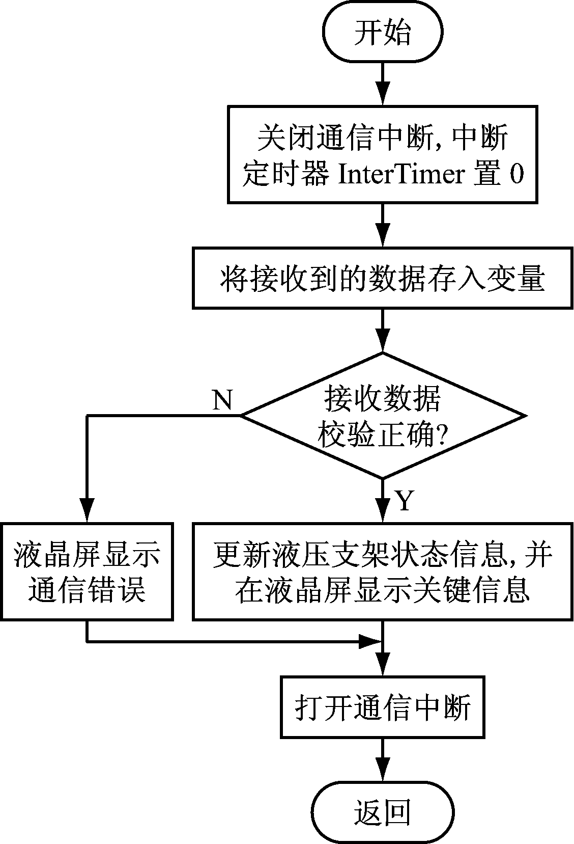 与按键中断服务类似,进入通信中断服务程序后也要关闭相应中断,并将全局变量InterTimer置0。控制器在收到数据后进行校验,如果校验错误则在液晶屏上显示错误信息,如果校验正确则根据通信协议分析指令内容,更新控制器内部的支架状态表及参数表,并将关键信息显示在液晶屏上。处理完成后打开通信中断并返回。通信中断服务程序流程如图5所示。