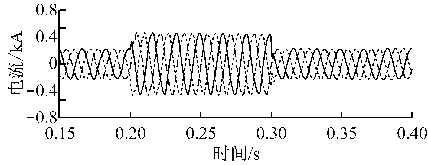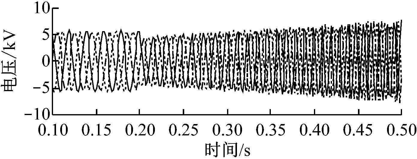 为验证牵引换流器对牵引电动机负载变化的适应能力,设置仿真工况2:交流电压为8 900 V;牵引电动机供电频率为60 Hz;在0.2 s时牵引电动机负载由3 MW突变至6 MW,并在0.3 s时由6 MW恢复至3 MW。牵引电动机负载变化时接触网电流及换流器三相输出电压、电流仿真波形如图5所示。从图5可看出,负载增大时接触网电流幅值增大,负载变小时接触网电流幅值变小;换流器三相输出电压幅值基本保持不变,电压波形良好;换流器三相输出电流注入牵引电动机,当负载变大时输入牵引电动机的电流增大,当负载变小时输入牵引电动机的电流减小,电流跳变过程平滑。仿真结果表明本文设计的牵引换流器能够较好地适应牵引电动机负载突变情况。