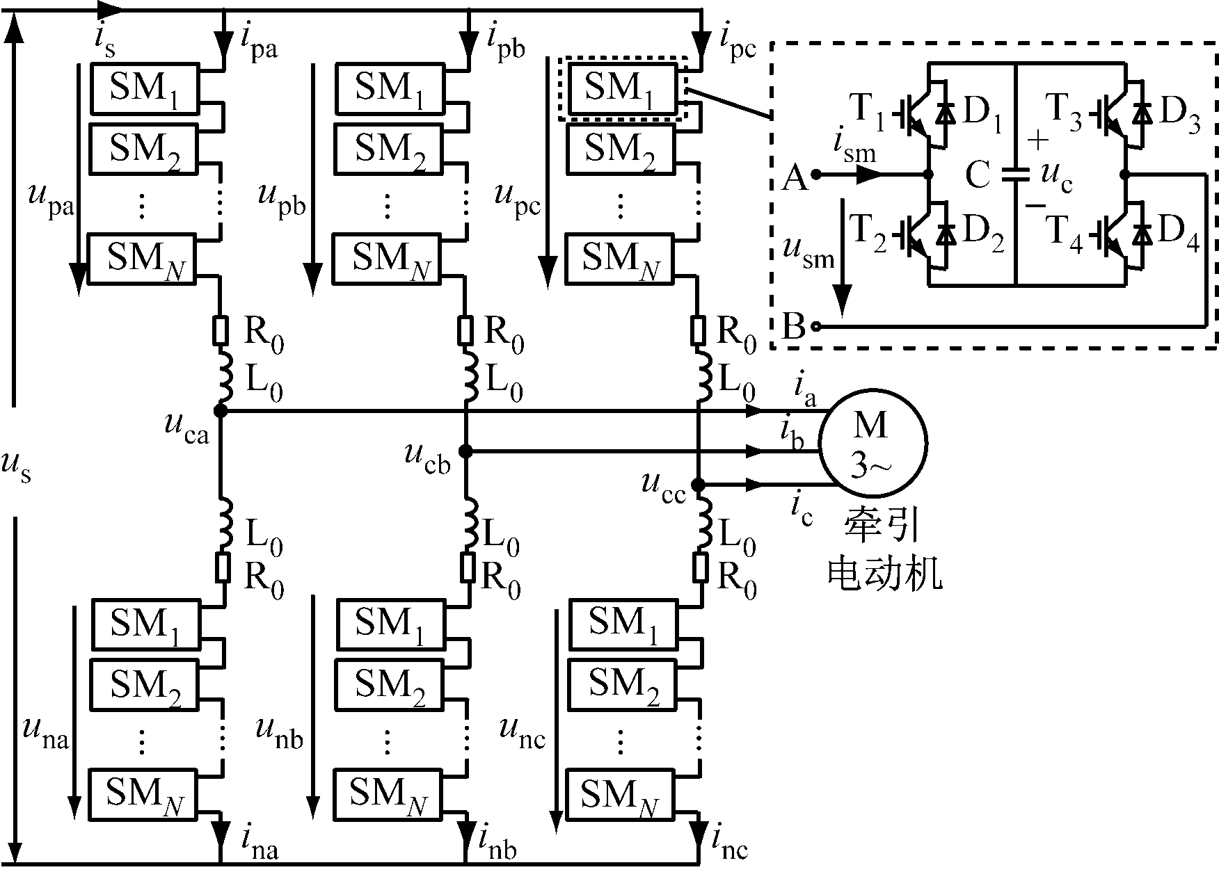 MMC结构的单相AC-三相AC换流器拓扑结构如图1所示。将接触网上的电压视为交流电源us,注入换流器的电流为is。换流器每相由上桥臂和下桥臂组成,每个桥臂包含N个级联的子模块SM1,SM2,…,SMN和1个桥臂电感L0、桥臂电阻R0。j(j=a,b,c)相上桥臂和下桥臂电压分别为upj和unj;j相上桥臂和下桥臂电流分别为ipj和inj;换流器输出电压为ucj;流入牵引电动机的电流为ij。