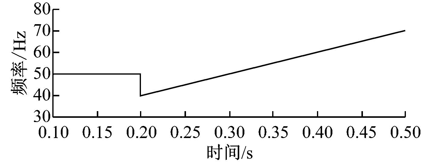 按照恒定的U/f调节换流器输出交流电压和频率。设置仿真工况1:在0.2 s时牵引电动机供电频率从50 Hz跳变至40 Hz,并以100 Hz/s的速度逐渐上升至70 Hz;设定U/f=120。牵引电动机变频调速时换流器输出电压及其频率仿真波形如图4所示。从图4可看出,0.2 s前换流器三相输出电压频率为50 Hz,幅值稳定在6 000 V;当牵引电动机供电频率跳变为40 Hz时,换流器三相输出电压没有冲击,幅值为4 850 V;随后牵引电动机供电频率逐渐上升,当频率达到70 Hz时,换流器三相输出电压幅值为8 410 V。随着牵引电动机供电频率的增大,换流器三相输出电压幅值及频率逐渐增大,且电压与频率的数值比与设定值120相差不大,此外没有冲击电压产生,三相电压动态过程平滑,表明本文设计的牵引换流器能够有效控制输出电压幅值和频率,适用于牵引电动机变频调速控制。