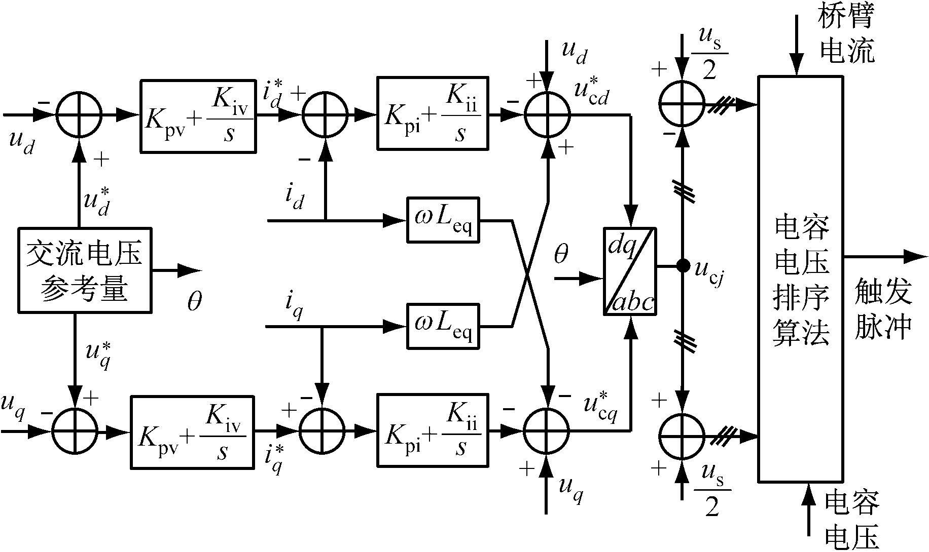 若忽略桥臂电阻R0与桥臂电感L0的损耗,由式(3)可得如下结论:① 为防止接触网电流严重畸变, 需控制换流器每相上桥臂和下桥臂电压之和(upj+unj)等于接触网电压us。② 为有效控制注入牵引电动机的电流,需控制(unj-upj)的大小来得到期望的输出电压。