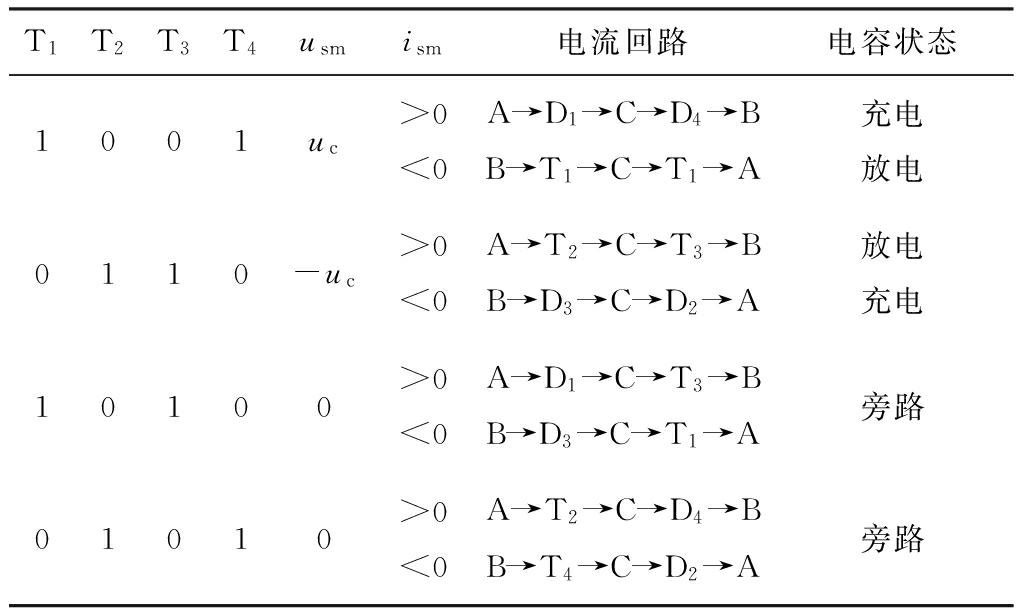 采用全桥型子模块(Full Bridge Sub-module,FBSM)构造桥臂。FBSM由功率开关T1—T4及其反并联二极管D1—D4与储能电容C构成。uc为电容电压;usm为子模块A,B端口电压;ism为子模块电流。为防止FBSM内部直接导通,不允许T1和T2(T3和T4)同时导通。根据T1—T4的开断状态(“1”表示导通;“0”表示关断)可得不同的FBSM工作状态,见表1。