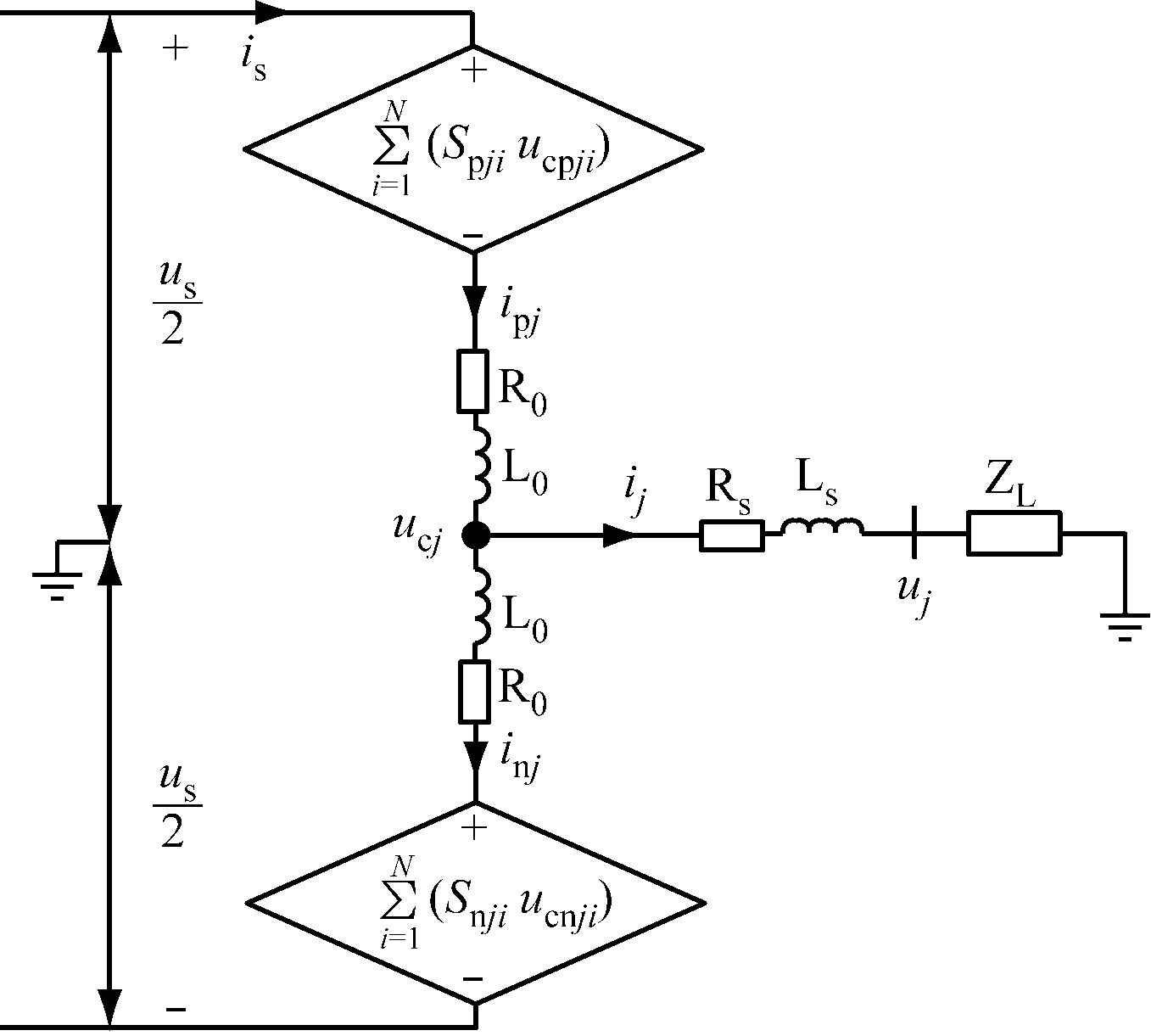 换流器各桥臂输出电压的本质是一个受控电压源[14-15],其单相简化等效电路如图2所示,其中ZL为牵引电动机的等效负载,uj为牵引电动机定子端电压,Rs和Ls分别为三相交流侧等效电阻、电感。