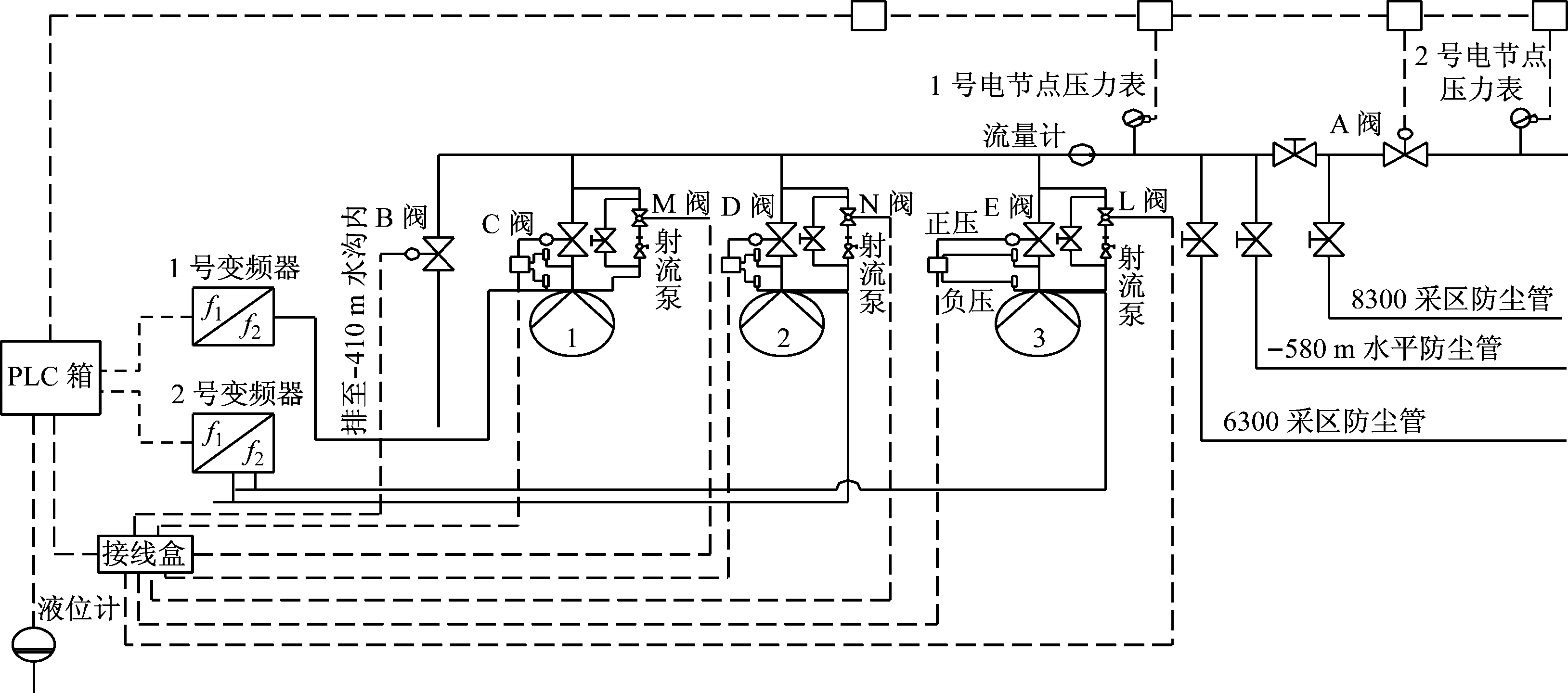 特殊情况:① 当水仓水位>1.2 m且管网压力≥4.15 MPa时,说明末端负荷用水量很少,但水仓水位很高,此时停止2号水泵运行,其余2台水泵变速运行,并将多余的水量通过潜水泵排放到-410 m水平的水沟内,再流至-410 m水平的泵房内。② 当2台水泵运行且水仓水位>1.2 m、管网压力≥4.15MPa时,说明末端负荷用水量更少,但水仓水位很高,此时应停止3号水泵,保持1号水泵正常调速运行。