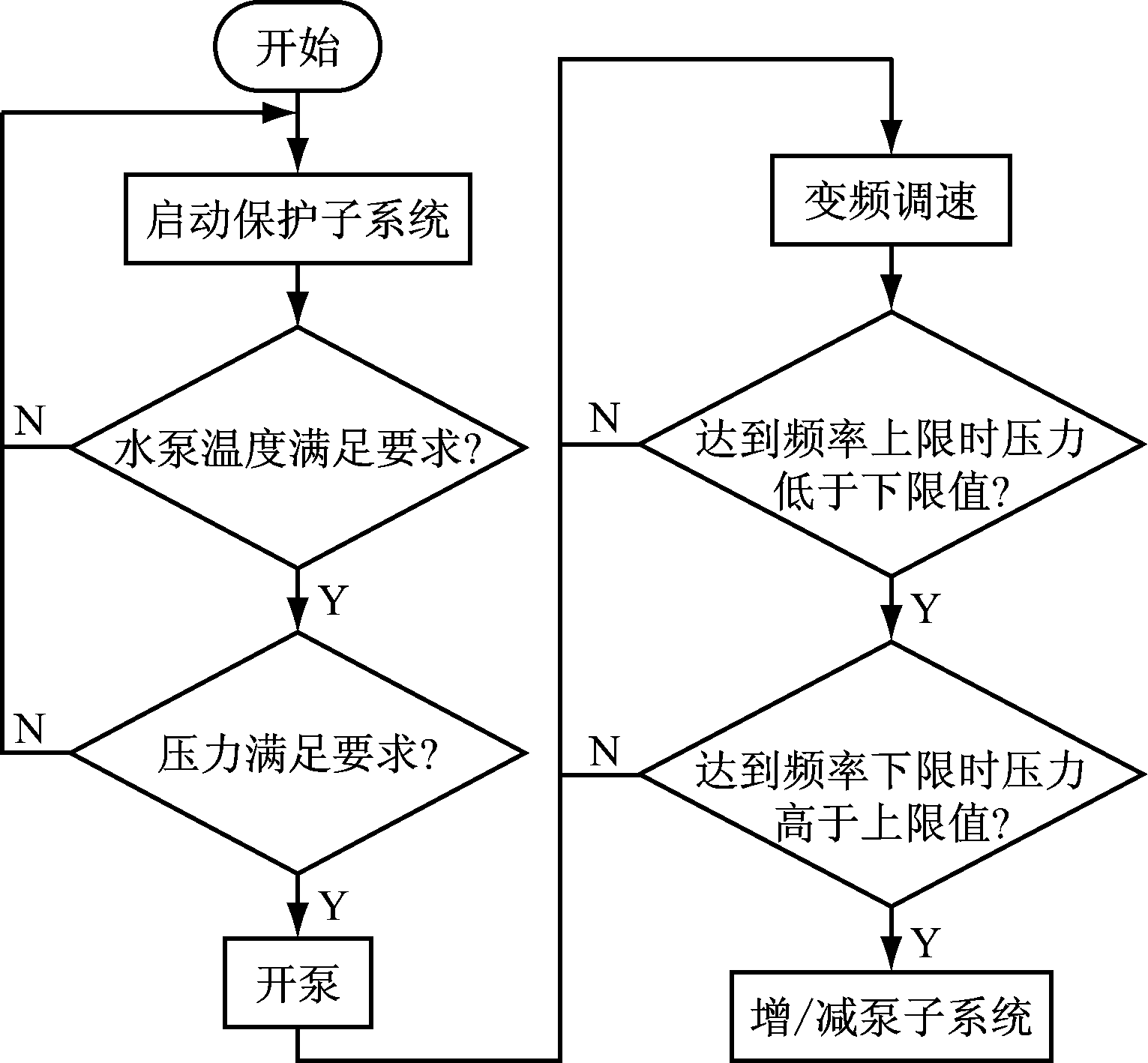自动恒压供水系统软件分为3个子程序:启动保护子程序、变频调速子程序、增减泵控制子程序。在水泵开启之前,启动保护子程序对水泵出水口压力及水泵自身温度进行检测,当两者同时满足开泵要求时才能使水泵正常启动。变频调速子程序根据设定的管网压力对水泵进行控制,实现末端负荷不确定的恒压供水。如果变频器的频率达到上限或下限时仍不能满足管网压力要求,再调用增减泵控制子程序来保持供水管路的设定压力。系统软件流程如图4所示。