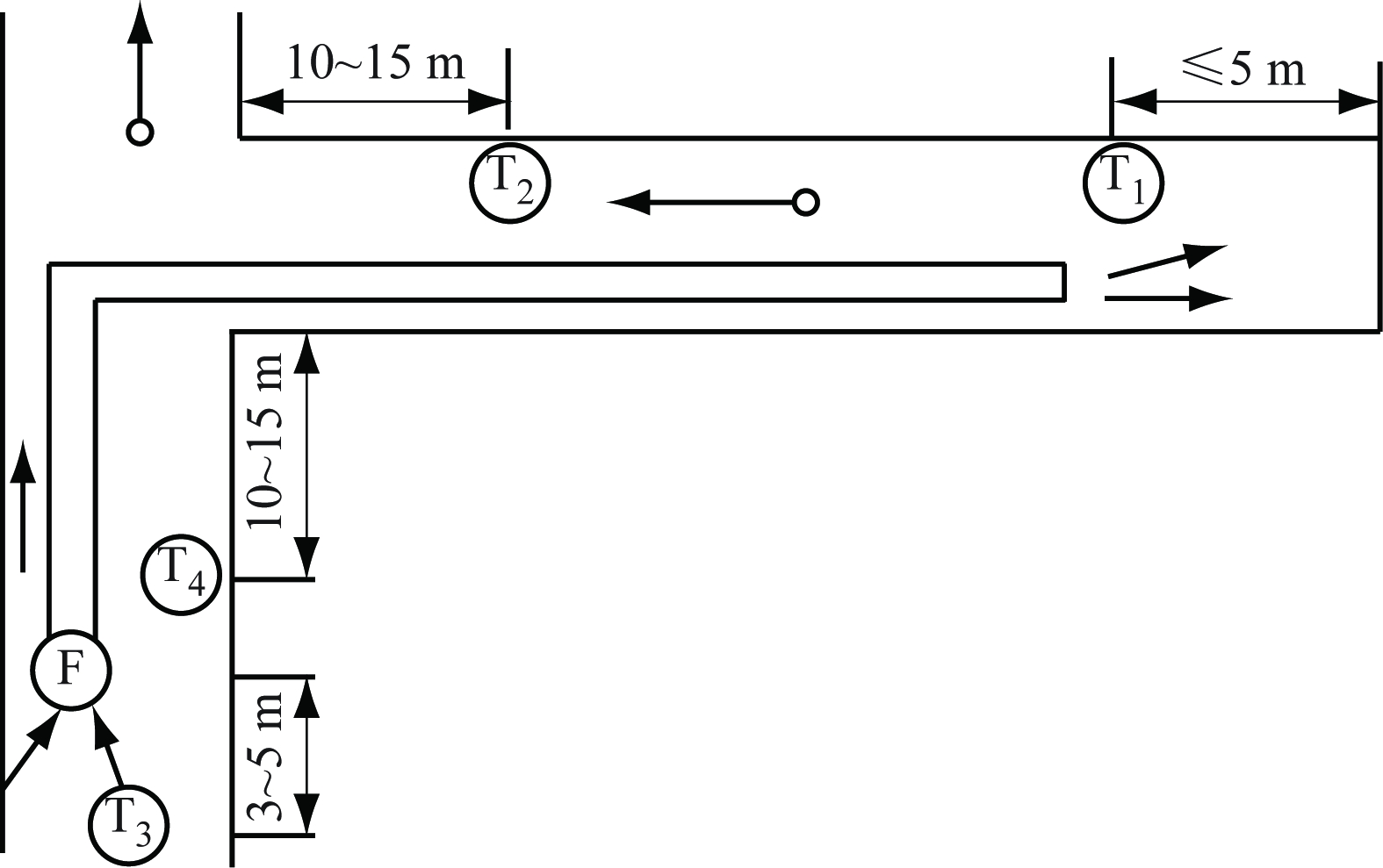 6.2.1 长壁采煤工作面甲烷传感器应按图1设置。U形通风方式在回风隅角设置甲烷传感器T0(距切顶线0~3 m),工作面设置甲烷传感器T1,工作面回风巷设置甲烷传感器T2;煤与瓦斯突出矿井在进风巷设置甲烷传感器T3和T4;采用串联通风时,被串工作面的进风巷设置甲烷传感器T4,如图1(a)所示。Z形、Y形、H形和W形通风方式的采煤工作面甲烷传感器的设置参照上述规定执行,如图1(b)—图1(e)所示。