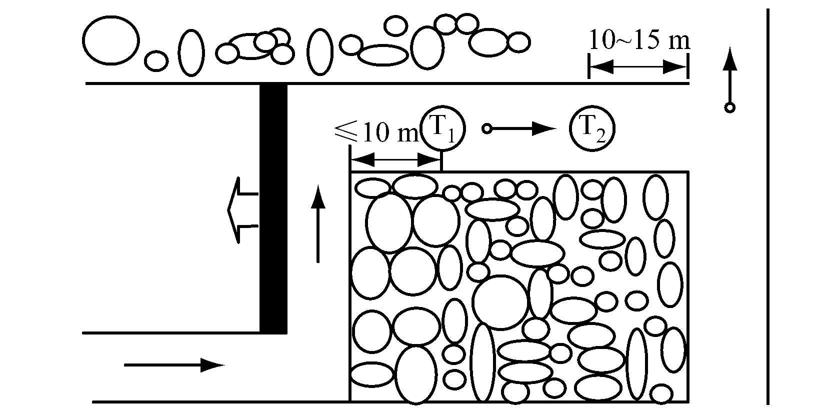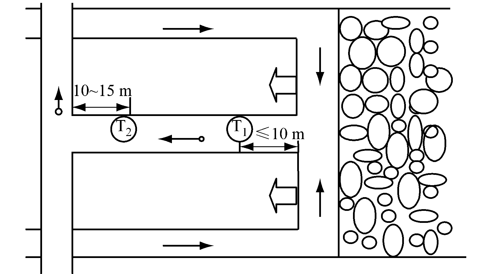 6.2.2 采用2条巷道回风的采煤工作面甲烷传感器应按图2设置。甲烷传感器T0、T1和T2的设置同图1(a);在第2条回风巷设置甲烷传感器T5、T6。采用3条巷道回风的采煤工作面,第3条回风巷甲烷传感器的设置与第2条回风巷甲烷传感器T5、T6的设置相同。